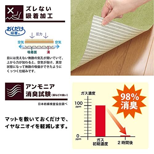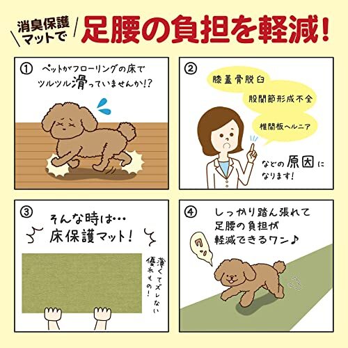 商品紹介 マットを敷くことで、フローリング床で滑っていたペットも爪を立てて歩くことができるので、足腰の負担を軽減できます。 爪キズや汚れから床を守ります。ロングサイズの裏面吸着加工のズレないマットですので、ペットが走り回っても、マットがズレたり、引っ掛かることがないので安心です。 汚れたら洗濯機で洗えるのでお手入れが簡単です。 撥水加工で水分が拭き取れます。繰り返しお洗濯でき、吸着効果は変わりません。 曲がり角などはマットを繋げてL型に敷いたり、柱回りなどの凹凸もハサミでカットすれば、ピッタリのサイズに敷くことができます。 使いたい場所に合わせてカットできるので、ゲージの中など1枚でいろいろ使用できます。 生地が薄いので、つまずきにくく、扉の開閉の妨げにもならず、廊下にも最適です。 掃除機をかけても吸い上がらず、楽にお掃除できるのでいつも清潔に保てます。 アンモニア消臭加工、床暖房OKで一年中使用できます。 使用上の注意 撥水加工は、防水仕様ではありません。濡れたときは早めに拭き取ってください。ニスを塗った床や老朽化した床には使用しないでください。 原材料・成分 表面:ポリエステル100%、裏面:アクリル樹脂(カテキン入り) 使用方法 床面のホコリ等を拭き取ってから、商品の裏面のフィルムを剥がしてご使用ください。
