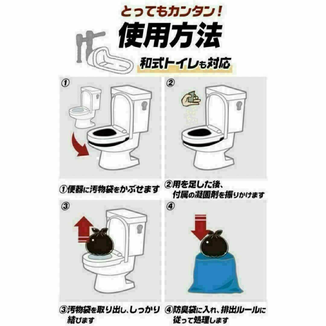 ★災害時のトラブル対策だけではなく、キャンプやアウトドア、交通渋滞、介護用と様々な場面でお使いいただけます! 使い方は便座に汚物袋(黒色の袋)を被せ、用を足した後に付属の凝固剤を振りかけます。 その後、汚物袋を取り出し、しっかり結び、防臭袋に入れて排出ルールに従って処理するだけ!