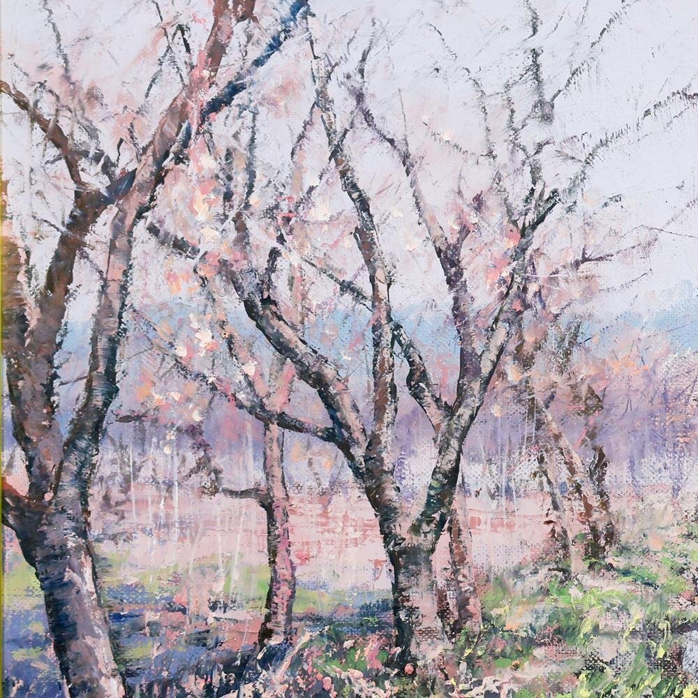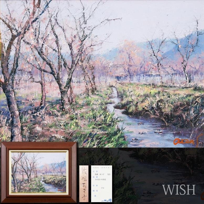 【真作】【WISH】佐藤あつ子「小川沿いの杏花」油彩 8号 1985年作 一枚の絵取扱作品 ◆杏花香る春の水辺  〇一枚の絵人気画家 #25102994
