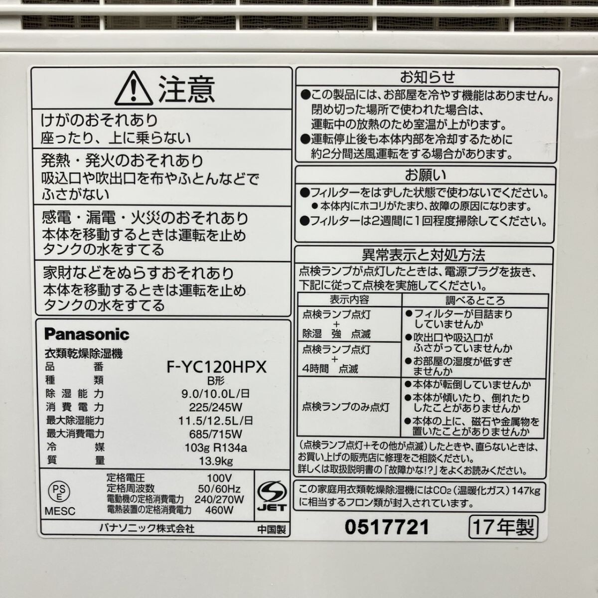 W208-F7-743 Panasonic パナソニック 衣類乾燥除湿機 F-YC120HPX 2017年製 通電確認済み FC