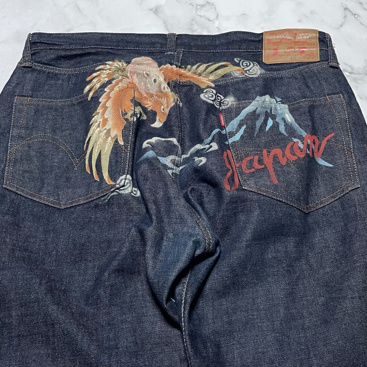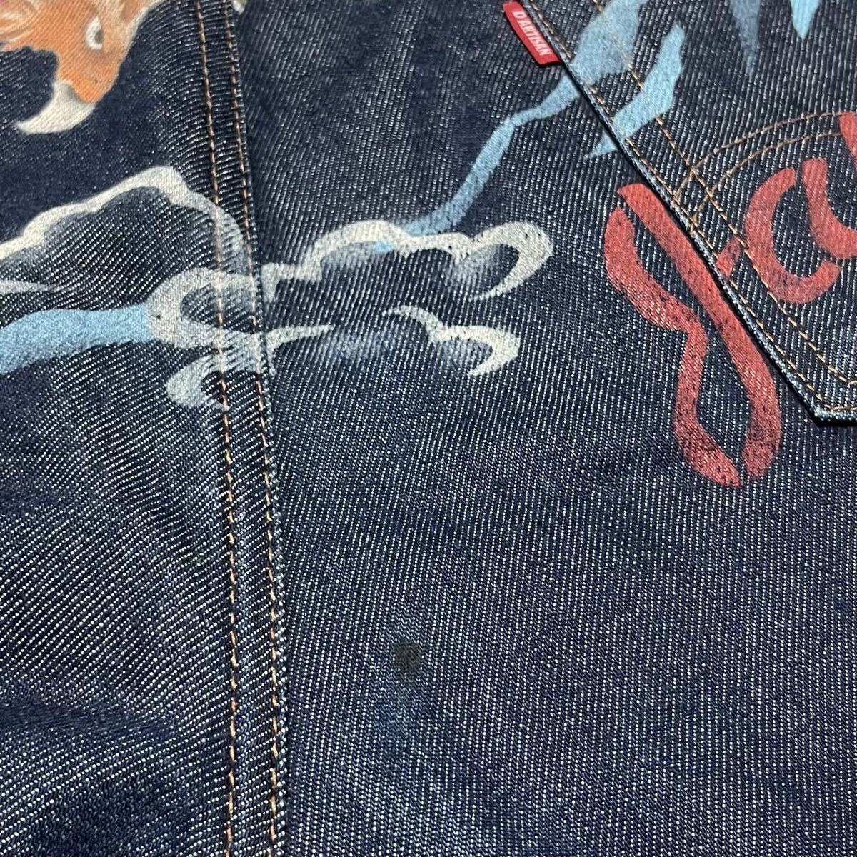 リベットやボタンにもブランドロゴが刻まれており、細部までこだわりが感じられる一本です。