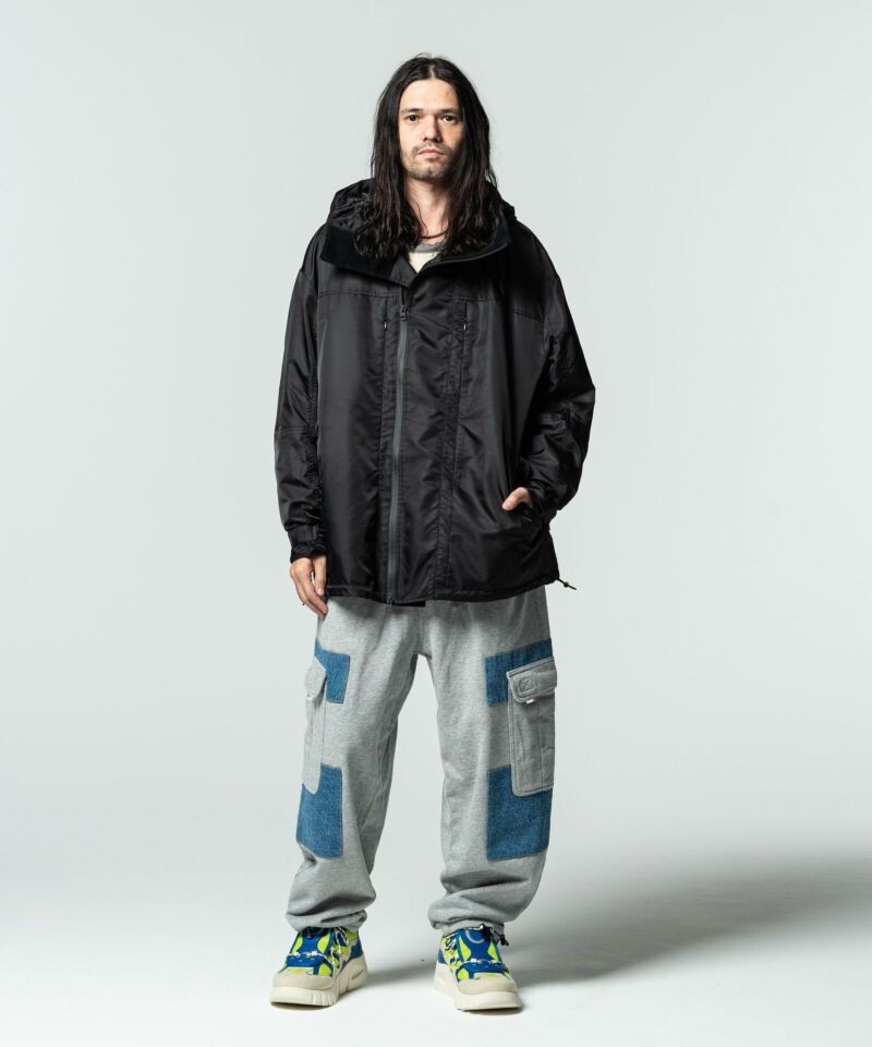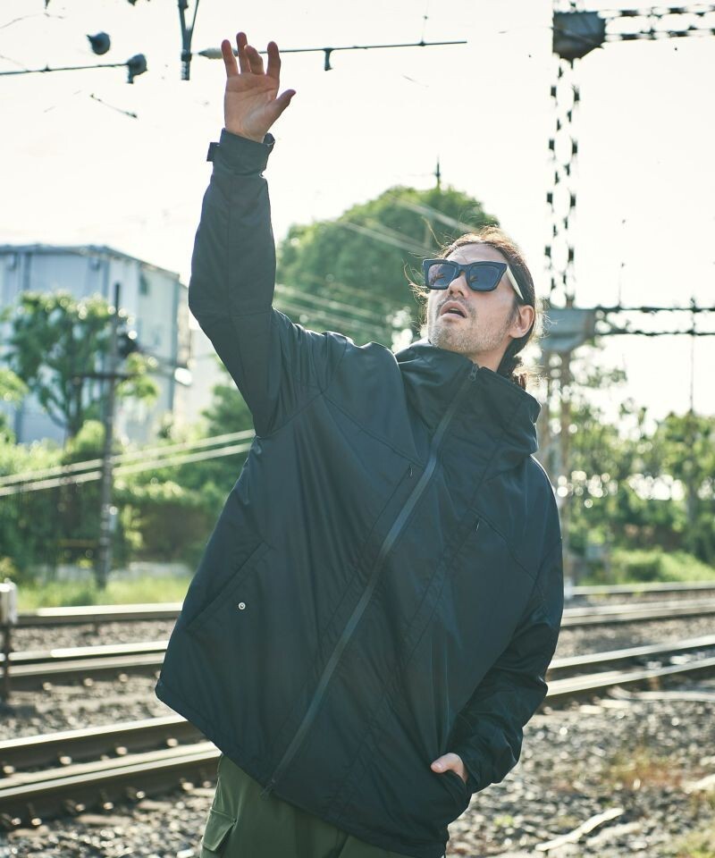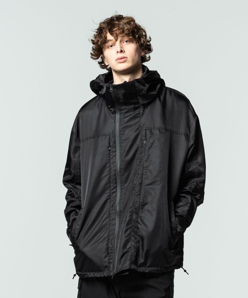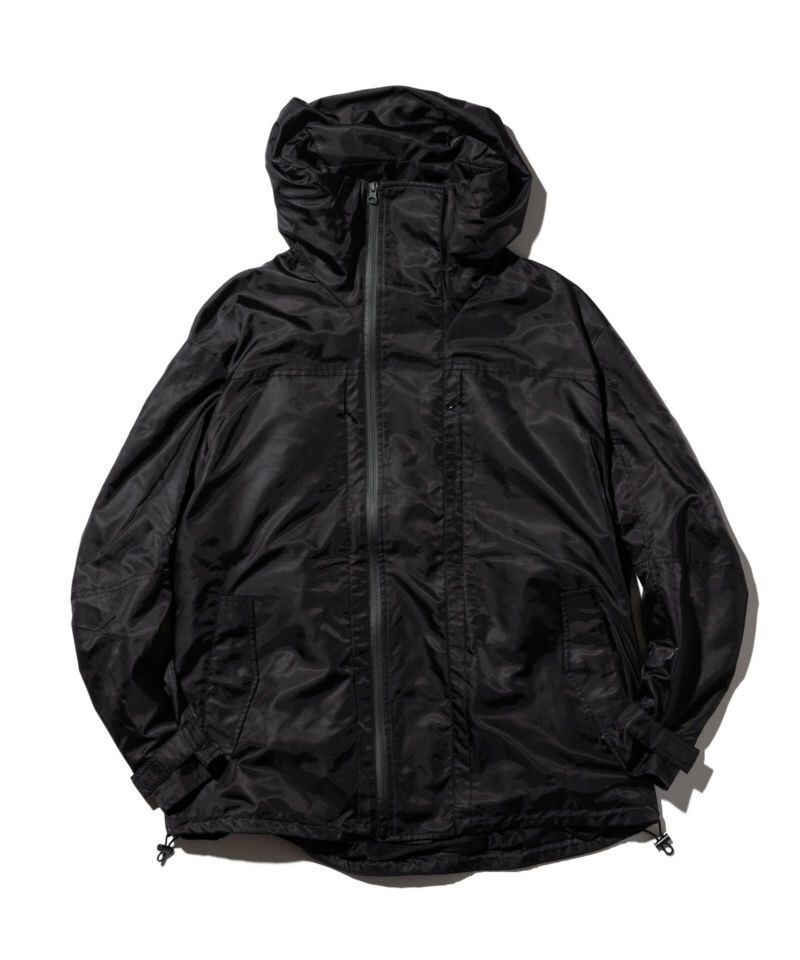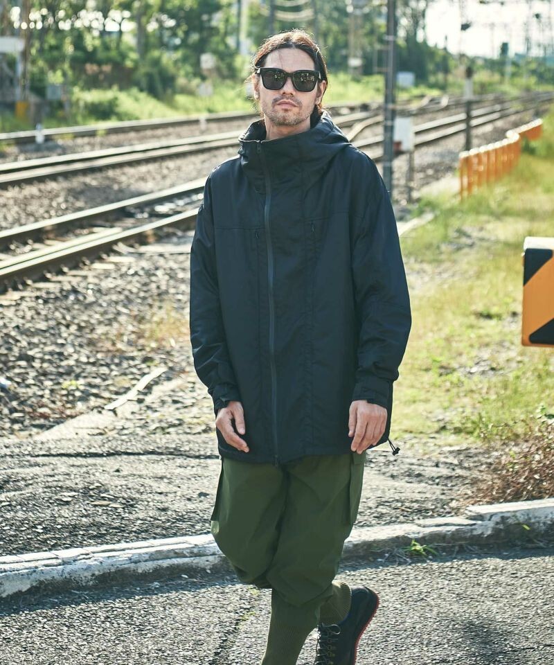 ミニマルに表現されたアウトドアスタイルの中にデイリーユースからレジャーシーンまで対応する確かな機能性を閉じ込めたMountain rain parka〈マウンテンレインパーカー〉。ボディのデザインは肩のヨーク部分とアームに切り替えを配したのみのフラットなものながら、首元のフードはブランドのパターンワークが発揮された立体的なハイネック。着こなしにモードなニュアンスを添えてくれます。テキスタイルには撥水加工を施したナイロン素材を使用。前合わせも止水ジップ仕様となっており、悪天候下においても安心してご着用いただけます。ユーティリティに関してもフラップ付きサイドポケットの他、右前身頃のロングジップの内側に2つのポケットを備えており優れた収納性を実現。さらにはフードの内側にあしらわれたフリース、裾を絞って防風性を高めるドローコード、レイヤードスタイルに使い勝手の良いフロントのWジップ仕様など数々の機能性を盛り込みました。