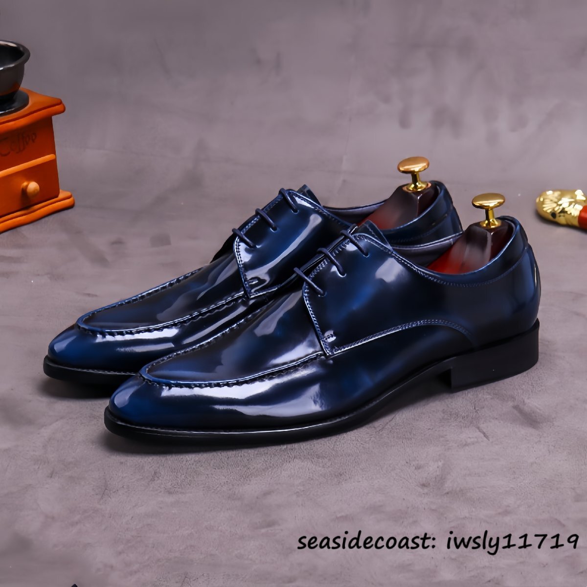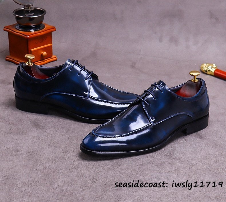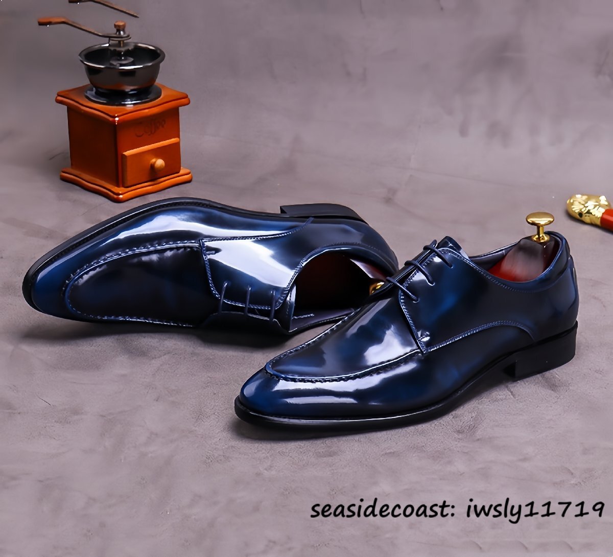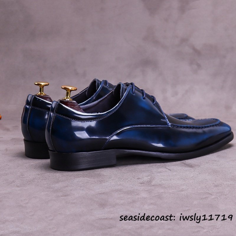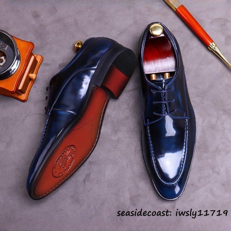最高級★定価9万 ビジネスシューズ メンズ 本革 レザーシューズ 上質牛革 フォーマル 紳士靴 ヴィンテージ職人手作り 革靴 ブルー 26.0cm