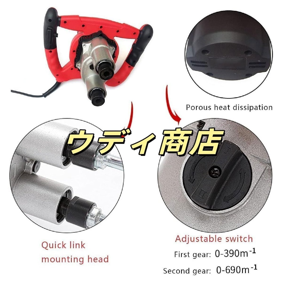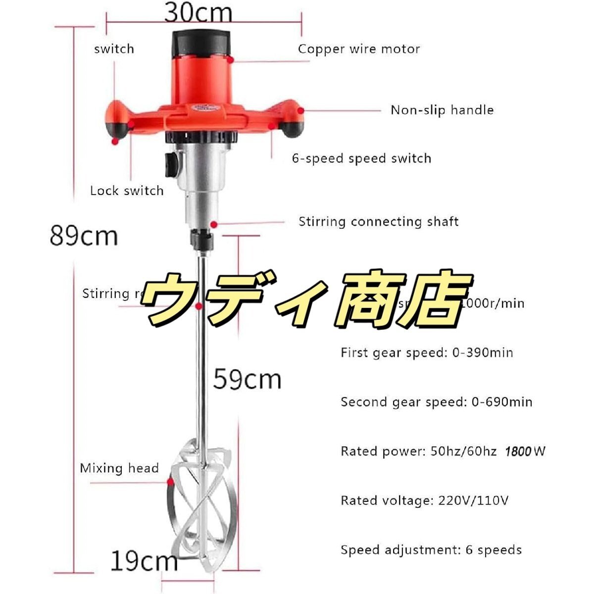 名前: 電気セメントミキサー 定格電圧:110V/220V 定格電力: 1800W 速度: 速度I: 0-620rpm/min、速度II: 0-820rpm/min オールの数:ダブルオール 包装内容明細書: 1x 電動ミキサー