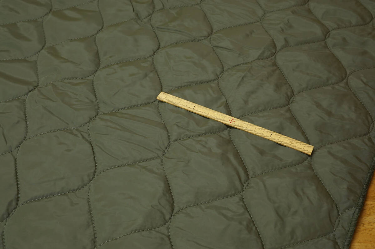 ポリエステル100%(表生地・中わた・裏生地)、微厚、キルト面はスルスル滑り感、ボア面はふっくら柔らかで、周りはロック仕上げ、色調:カーキ×黒ボアでございます。