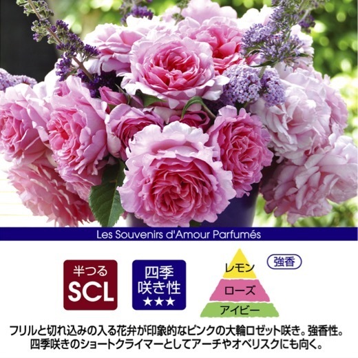 フリルと切れ込みの入る花弁が印象的なピンクの大輪ロゼット咲き。強香性。四季咲きのショートクライマーとしてアーチやオベリスクにも向く。「ウェルカム」という意味を持つ花が、華やかな色と香りで歓迎してくれる。第11回ぎふ国際ローズコンテストベストフレグランス賞受賞。レモンのさわやかな香りはローズの甘さに変わり、しっとりとしたアイビーの香りも混じる。