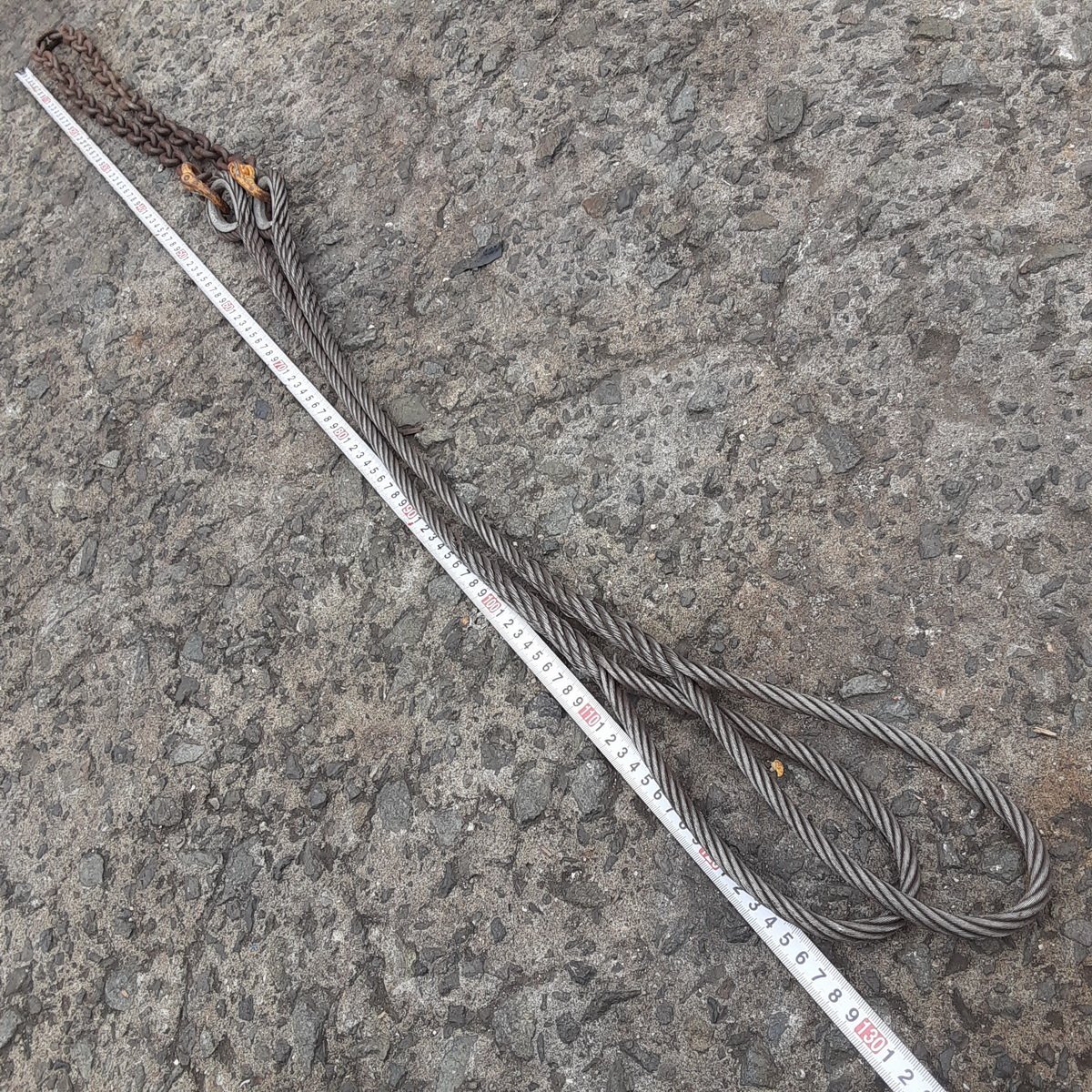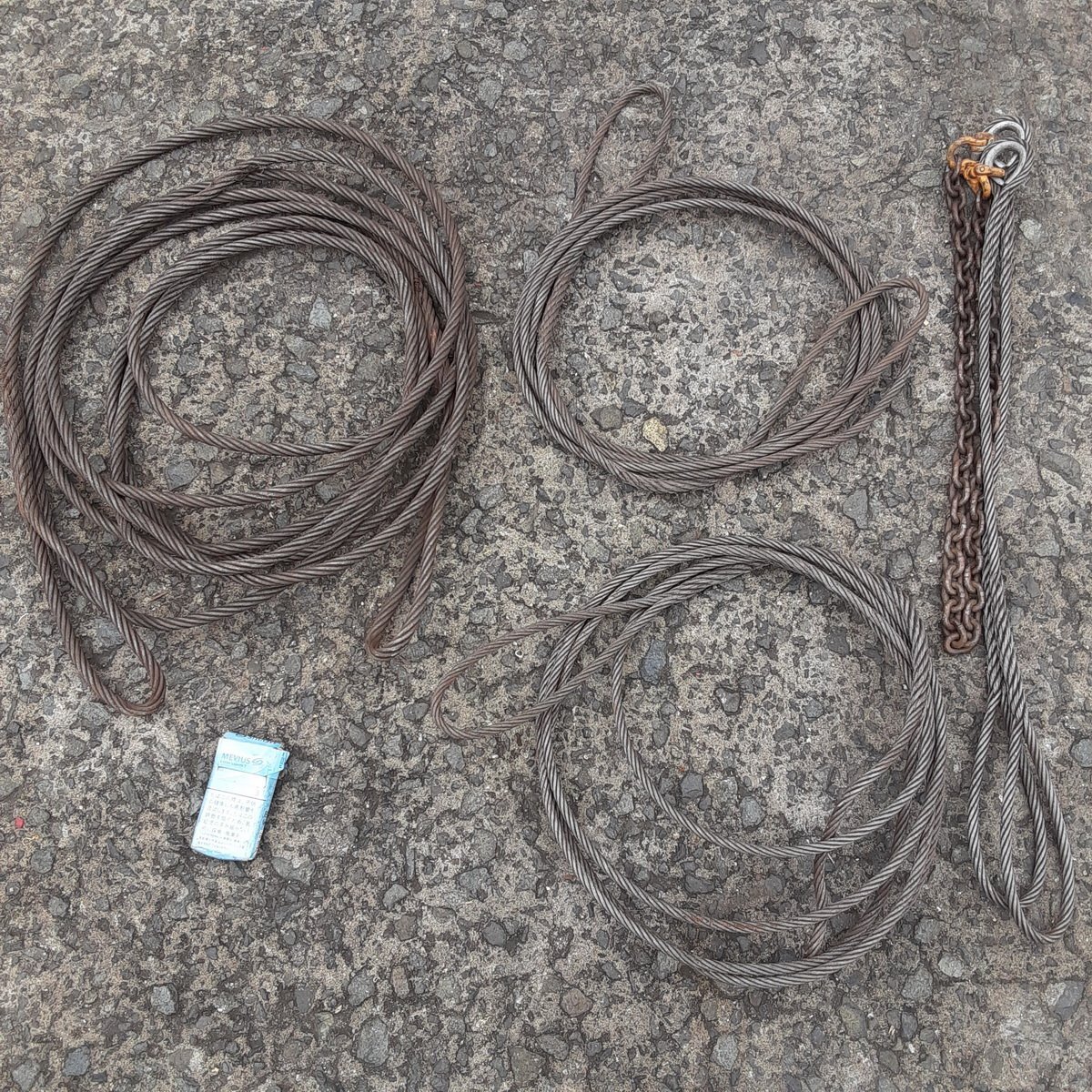 | 商品 | ■吊りワイヤー ワイヤーロープ 玉掛けワイヤー 径約Φ9~13mm 長さ約5m~10m チェーンワイヤー(全長約2.5m) 計4本セット |