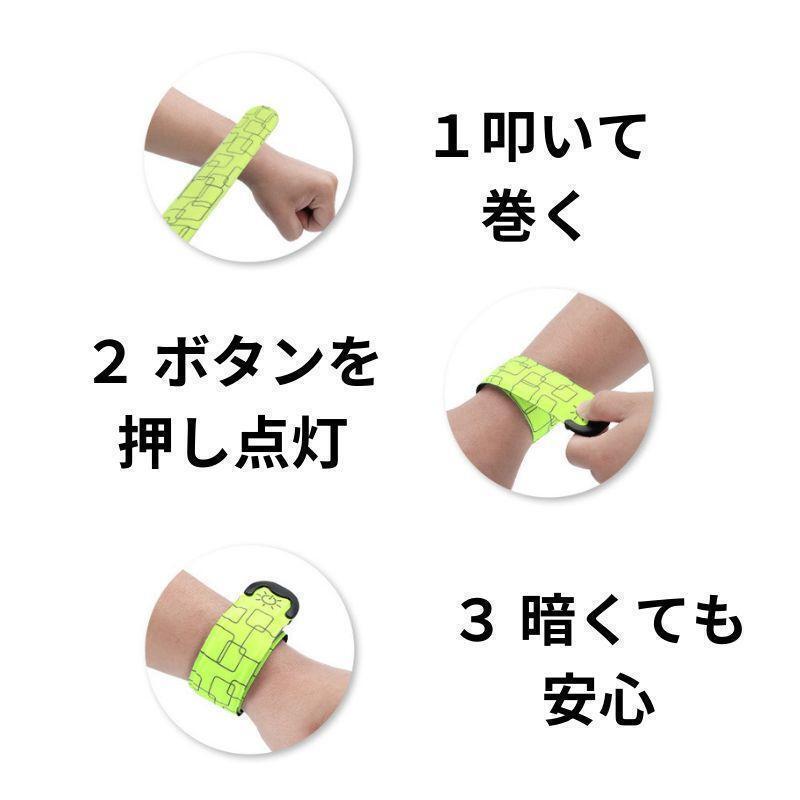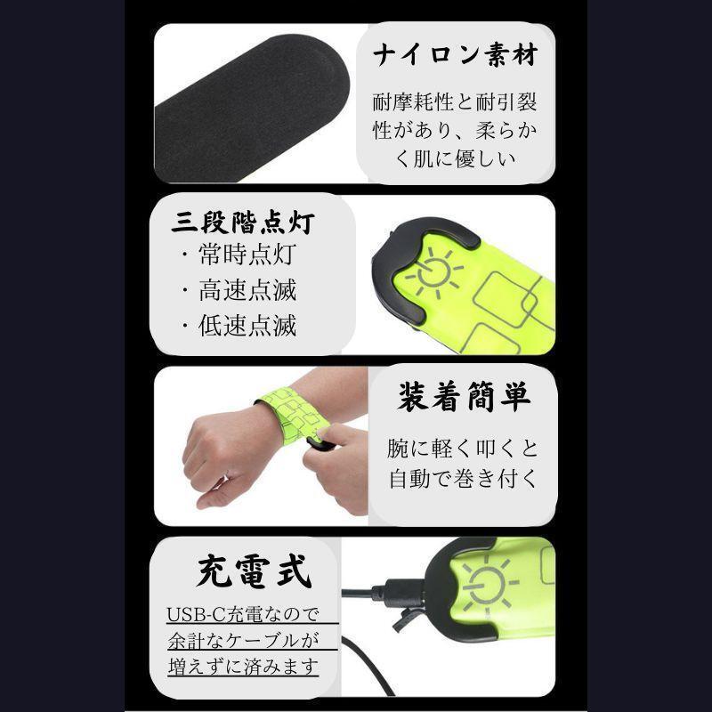 高視認性: LEDライトは従来の反射バンドよりも明るく、夜間の活動時に車や自転車、歩行者に対して高い視認性を提供。