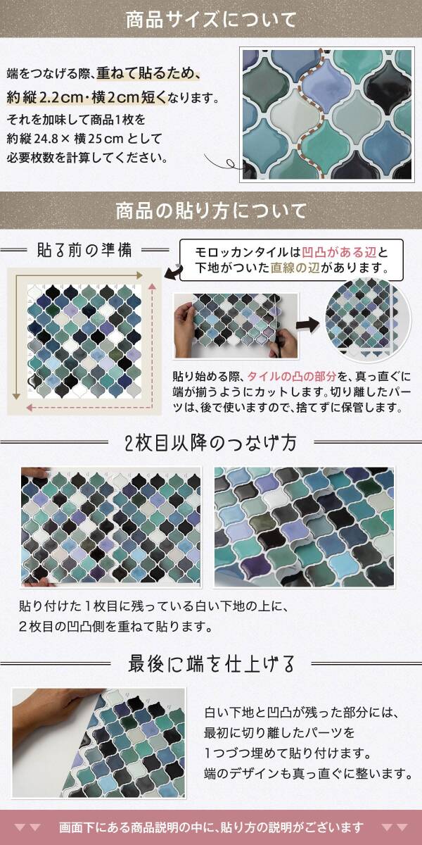 【シリーズ累計販売70万枚突破!】水回りを一瞬で華やかに演出できる、今話題のモロッカン・コラベル・ランタンデザインのタイルシートです。まるで本物のタイルのような自然な光沢と鮮やかな発色、手に取ると感じるぷっくりとした凹凸感が、ワンランク上の空間を叶えます。シール感がなく高級感たっぷり。水回りはもちろん、家具や雑貨のアクセントにもぴったりです。 【賃貸でも安心!貼ってはがせる簡単DIY】マスキングテープを下地に使えば、賃貸のお部屋でも壁を傷めずきれいに剥がせます。特別な道具や接着剤は一切不要。台紙から剥がしてそのまま貼るだけ、サイズ調整もはさみやカッターで簡単にカットできるので、初めての方でも気軽にDIYを楽しめます。※マスキングテープは、火気に近い場所へのご使用はお控えください。 【耐熱120℃・国内検査済みで安心】国内の公的検査をクリアした耐熱アルミニウム素材を採用。コンロまわりやキッチン、洗面台など熱や蒸気が多い場所でも安心してお使いいただけます。優れた耐水性・耐熱性で、毎日の家事も快適にサポートします。 【お手入れラクラク&いつでも清潔】防汚性に優れたアルミ素材だから、油や汚れがつきにくく、サッと水拭きするだけでいつでも清潔。キッチンや浴室、トイレなど水回りのリフレッシュに最適です。 【大判サイズでコスパ抜群】27cm×27cm、厚み約1mmの正方形サイズで、広い面積もスピーディーに貼れます。お得なサイズで水回りのリメイクや模様替えにも大活躍!素材:本体/アルミ、PVC、裏面/アクリル系粘着剤