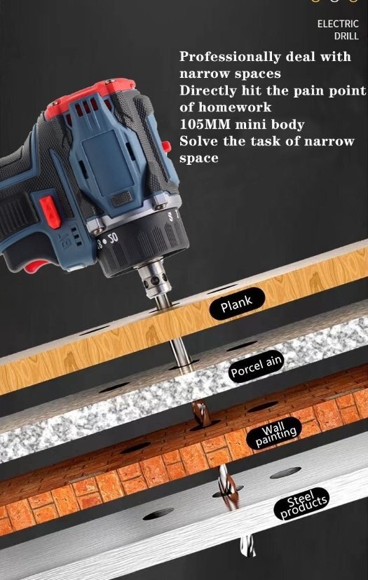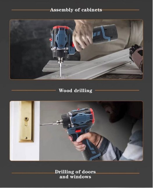 【2 in 1機能】電動ドリルセットには、電動ドライバーとインパクトドリルの2つの使い方があります。建築装飾、家電製品や家具の設置とメンテナンス、DIY木工などのネジ締めに適しています。木材、金属、石、コンクリートなど、さまざまな素材に穴を開けるのに使用できます。複数の冷却穴、効率的な放熱、長時間の作業でも熱くなりません。