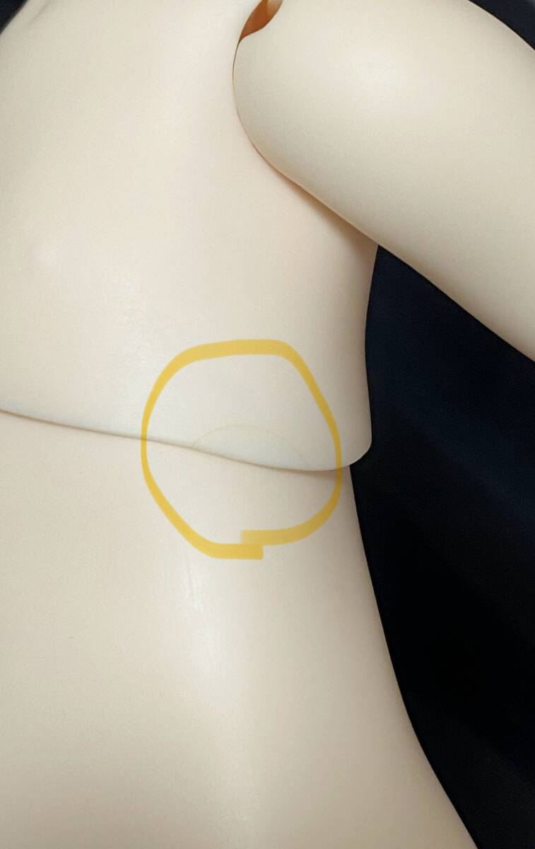 胸パーツ左下部分が欠けてしまったため瞬間接着剤パテにて接着してあります。