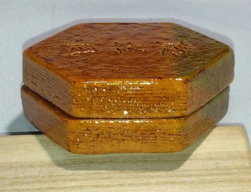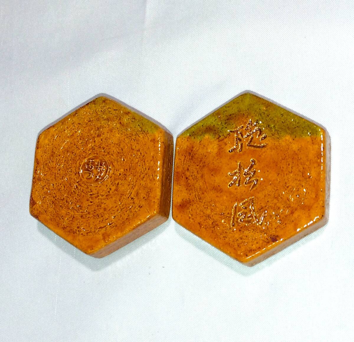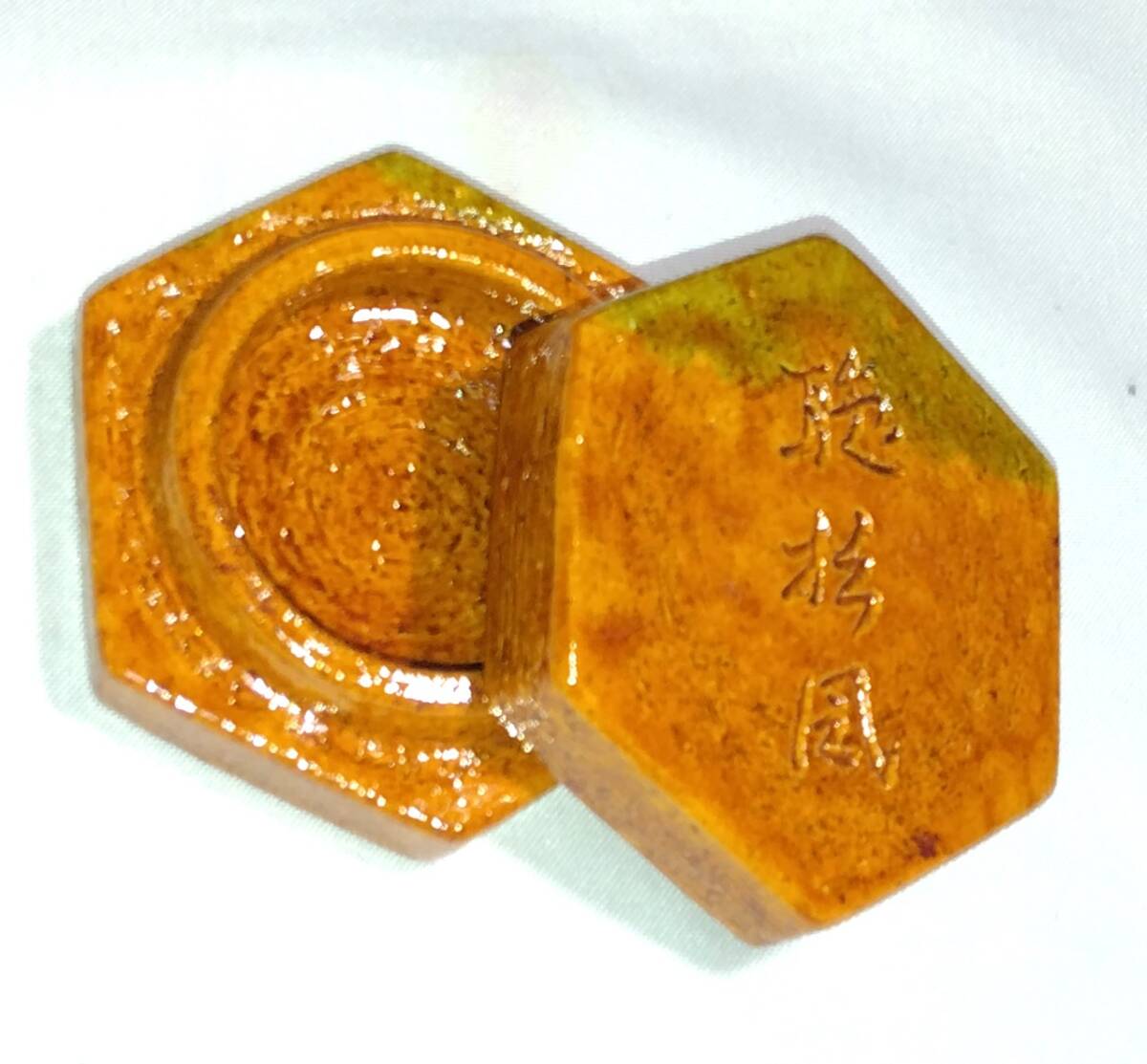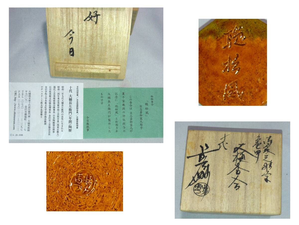 大樋長左衛門 飴釉亀甲香合 「聴松風」 の出品です。使用される事なく大切に所蔵されてました飴釉香合の逸品、極微細な擦れ等の他特に目立つダメージ無く大変きれいな良い状態です。裏千家16代坐忘斎宗匠の彫刻字「聴松風」を蓋表に頂いてます。