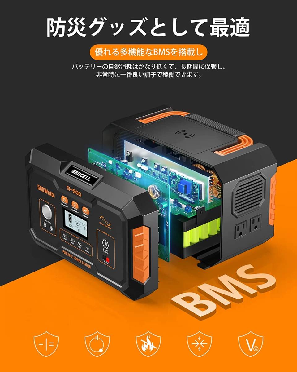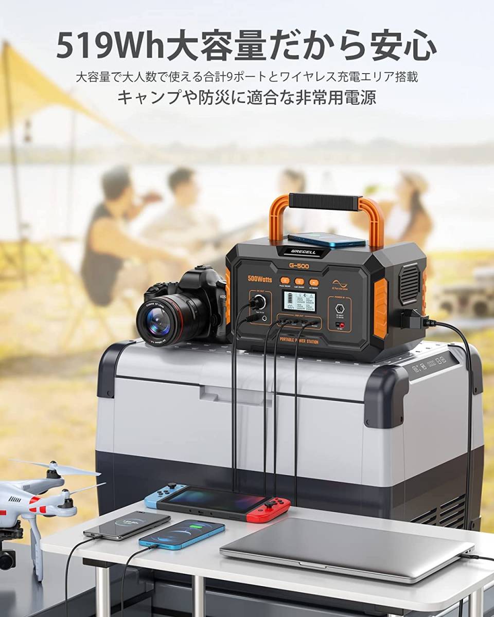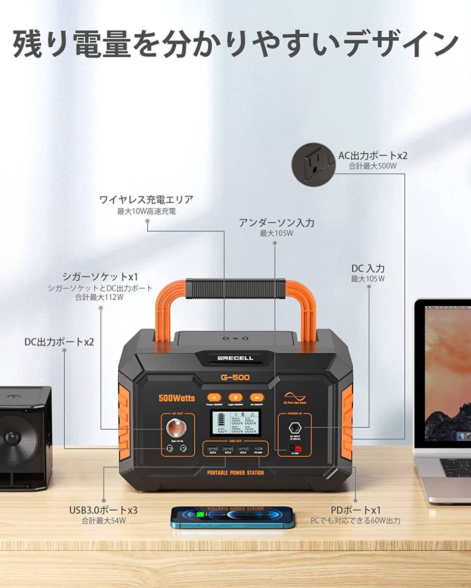 【新品】GRECELL ポータブル電源 G-500 140400mAh/519wh ワイヤレス充電搭載 10台同時充電 停電対策 PSE認証済み