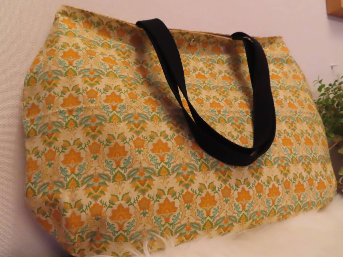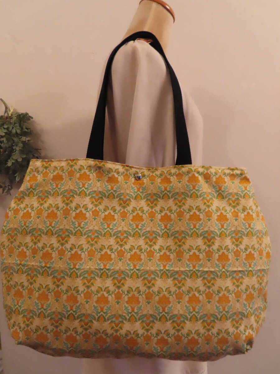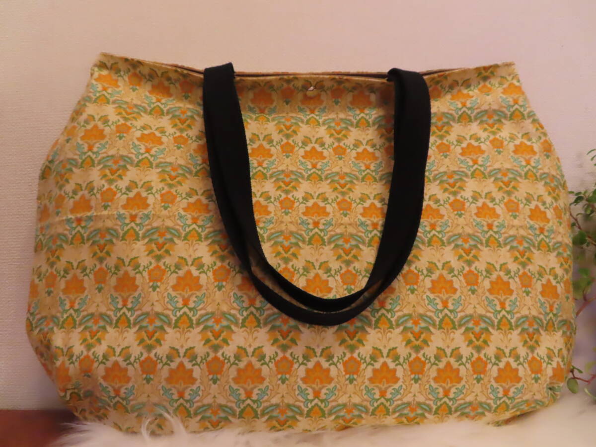 42 ハンドメイド ころんと丸い BIG肩掛けトートバッグ ダマスク模様 マスタードブラウン 柄 プリント