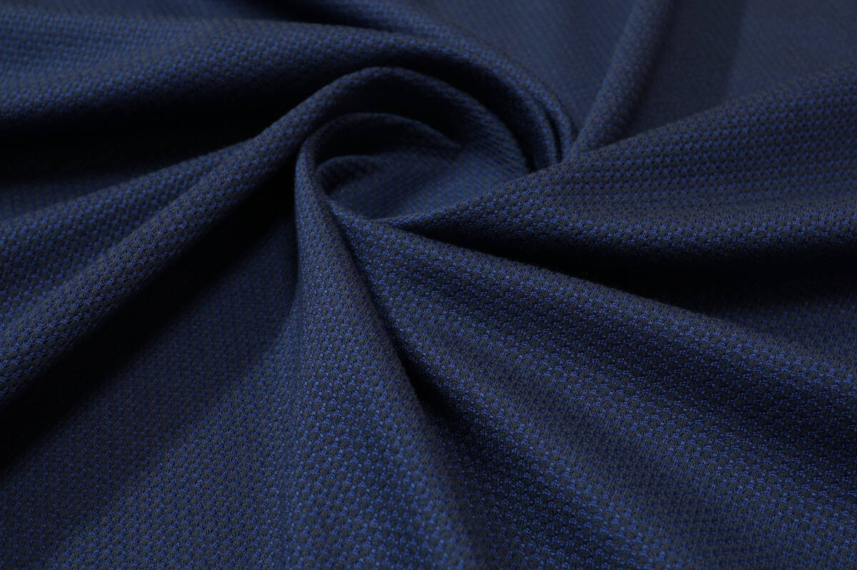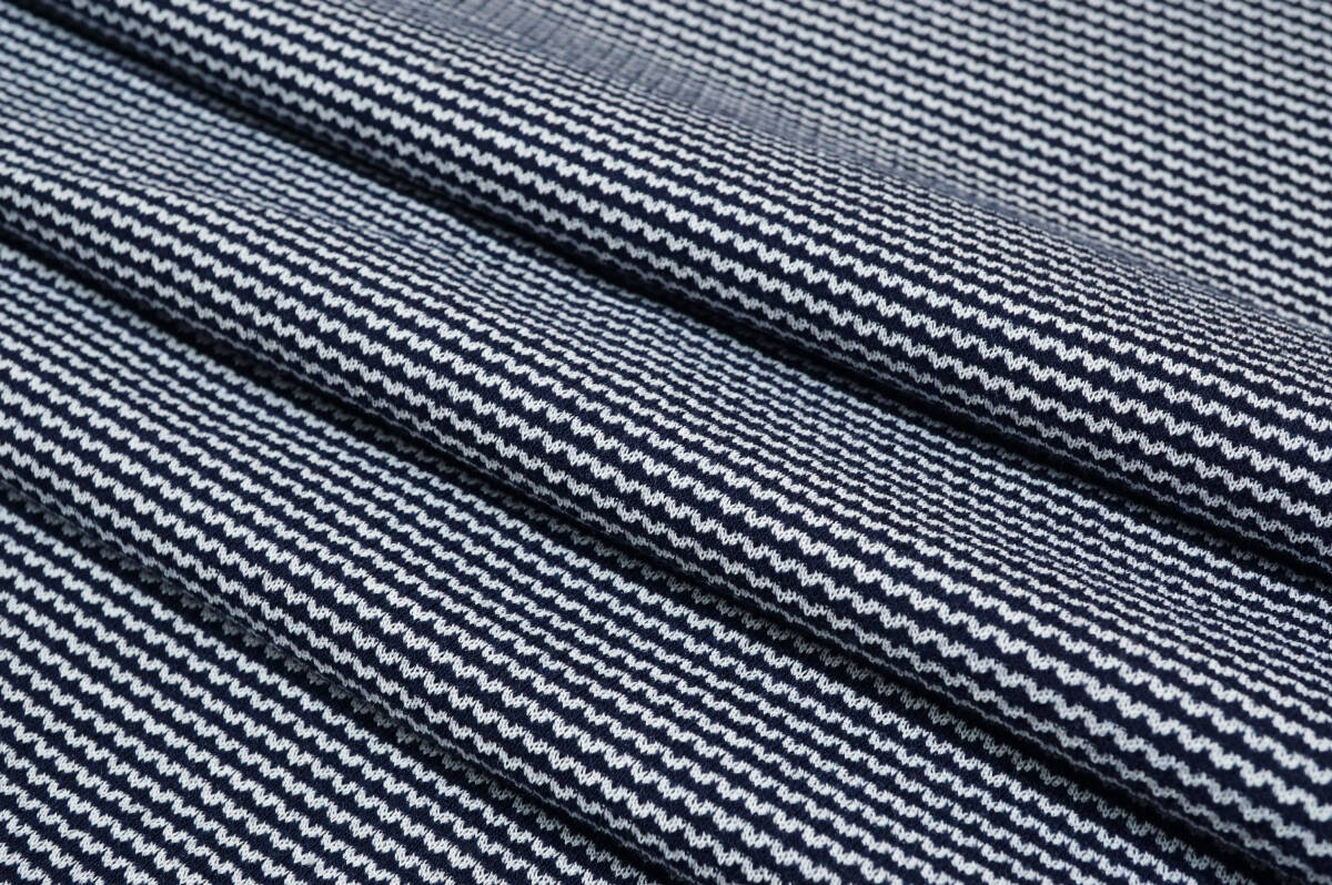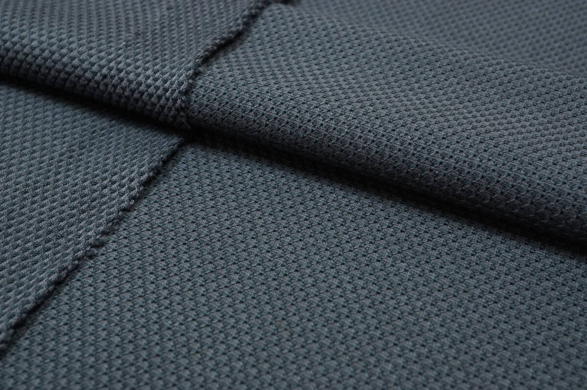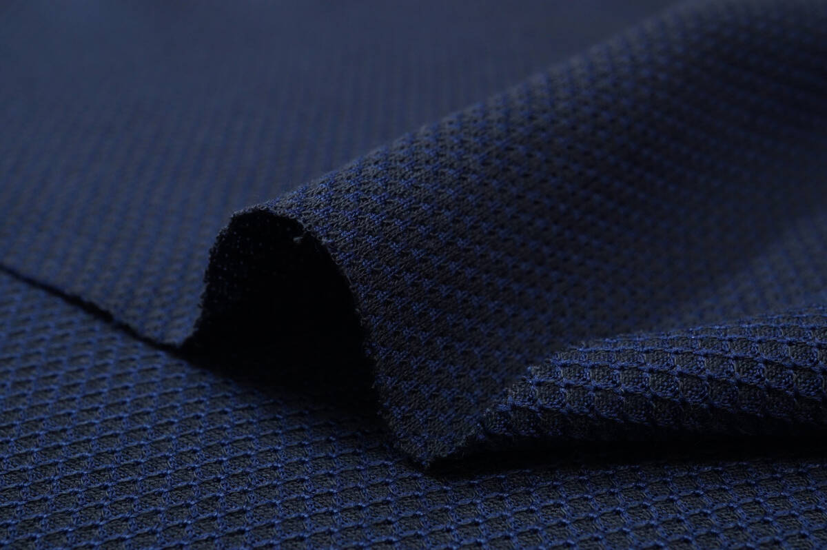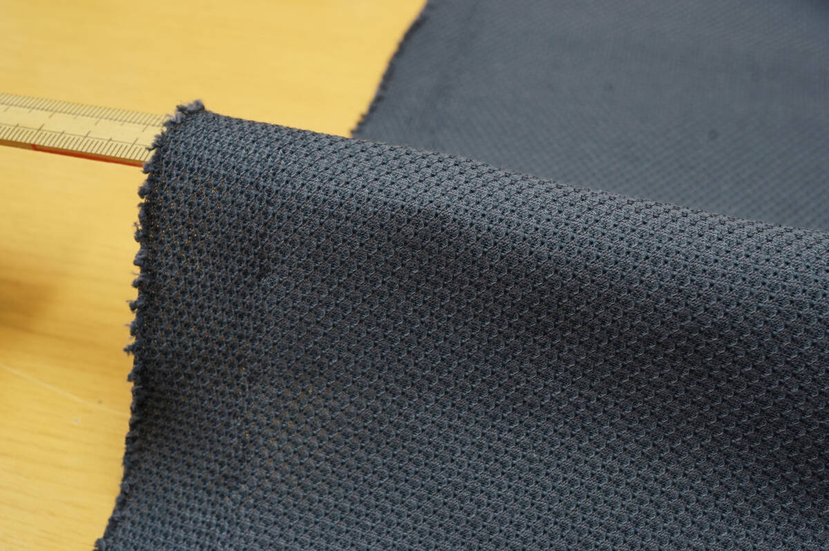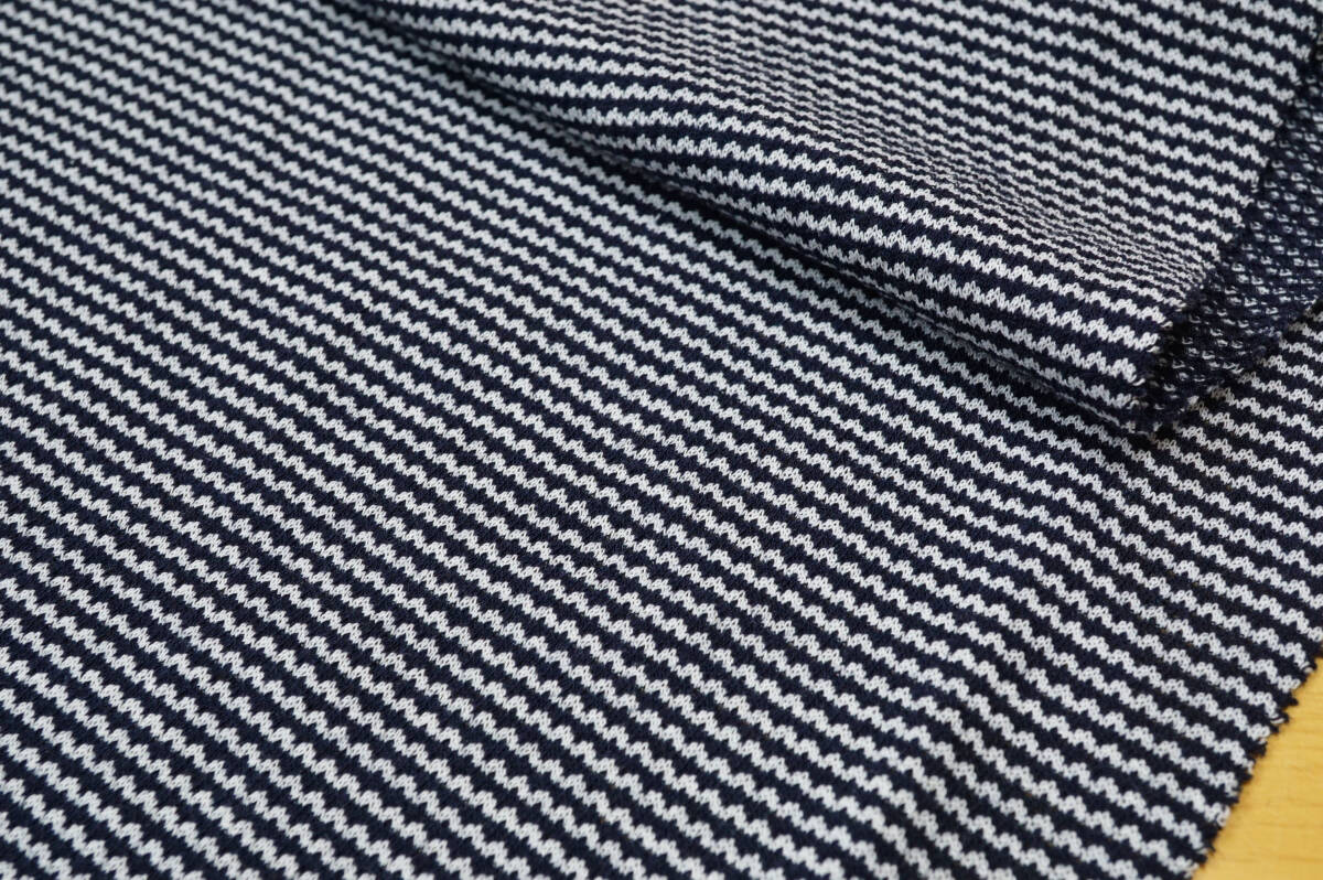 綿/微エステル混、サラリとした肌触り、微薄~ほぼ中厚(一般的なポロシャツ対応の鹿の子ニット地程度)で、ややソフト系、1WAY伸縮仕様、わずかな透け感、色調:ネイビー、グレー、紺×白の3色でございます。