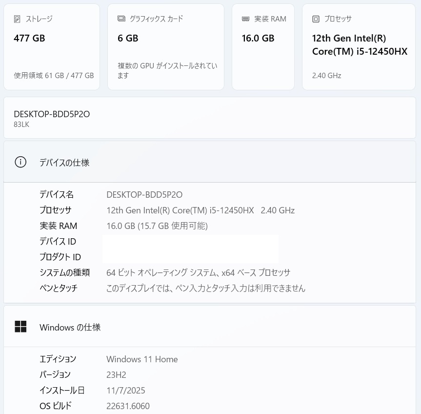 CPU:第12世代 インテル Core i5 12450HX(Alder Lake) 8コア