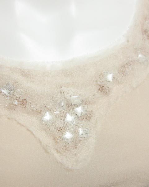 | シルクシフォンの華やかなドレス。エンパイアデザインで、スタイル良くみせてくれます。胸元にはゴージャスなビジューがついていてちょっとしたパーティーなどにもおすすめのアイテムです。上品な薄い黄ベージュでエレガントに着て頂けます。 |