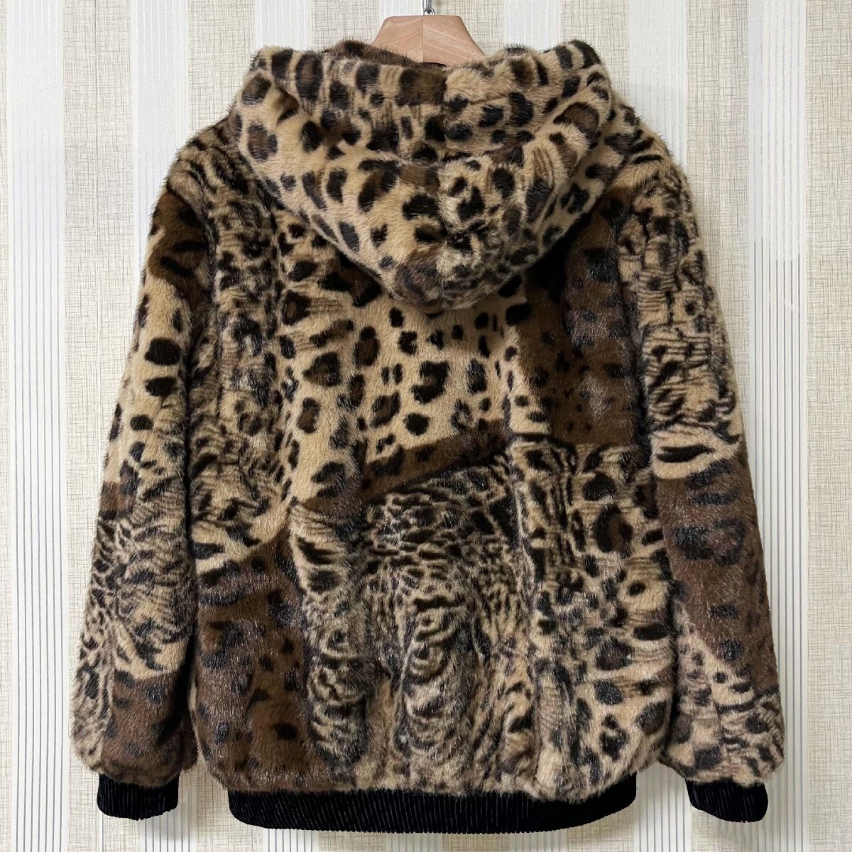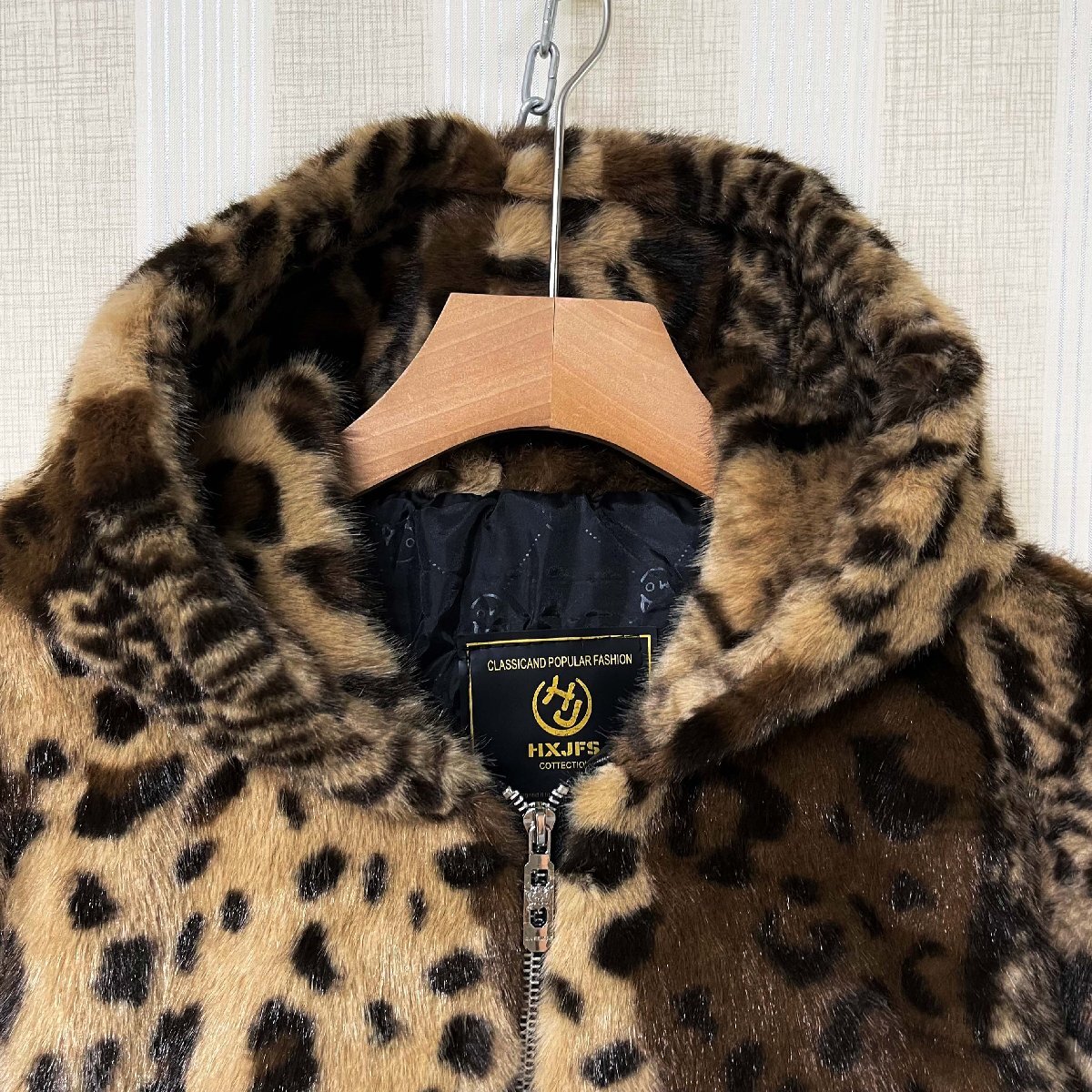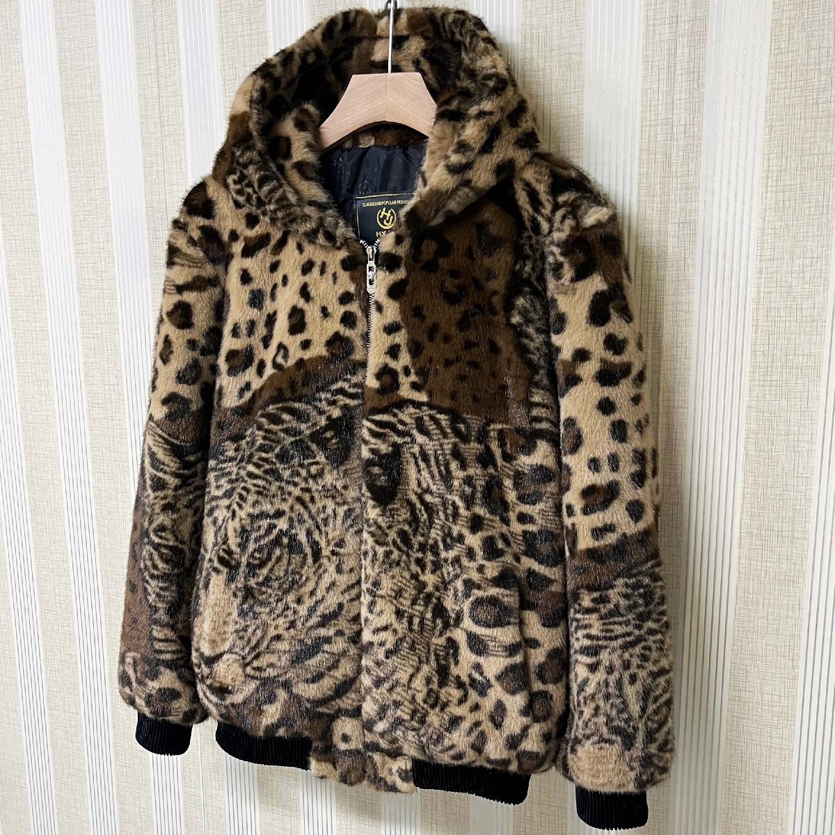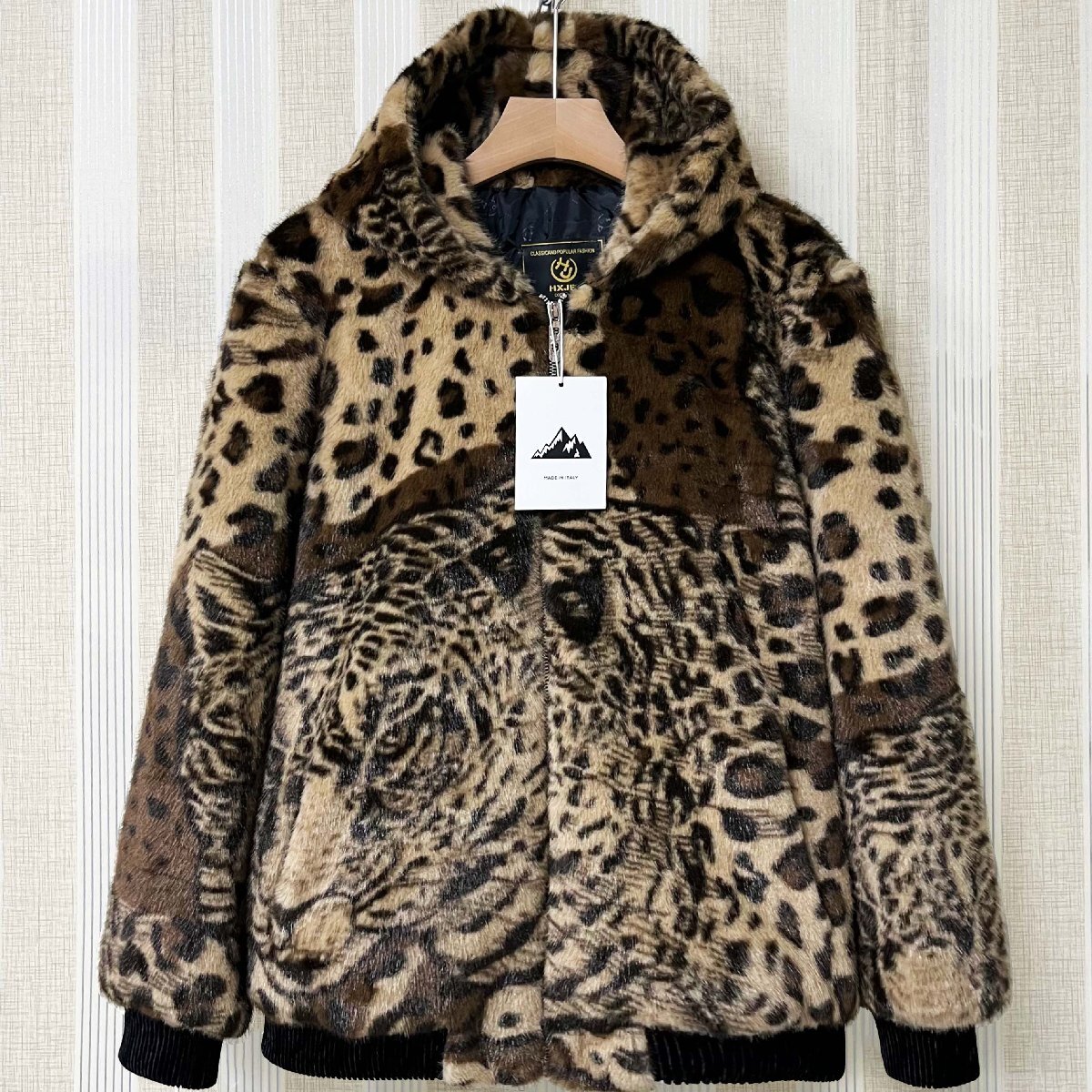 毛皮コート イタリア製造 ミンク混 暖かい ヒョウ柄 フード付き ジャケット コート アウター ブルゾン ファンコート 秋冬 真冬 SIZE:XL