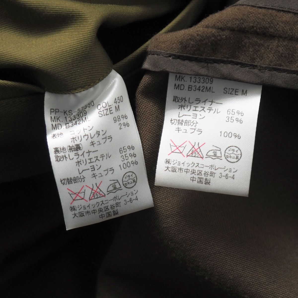 | 素材 | 本体 表地 :コットン98%、ポリウレタン2% 裏地(袖裏):キュプラ 取外しライナー ポリエステル65% レーヨン35% 切替部分 :キュプラ100% |