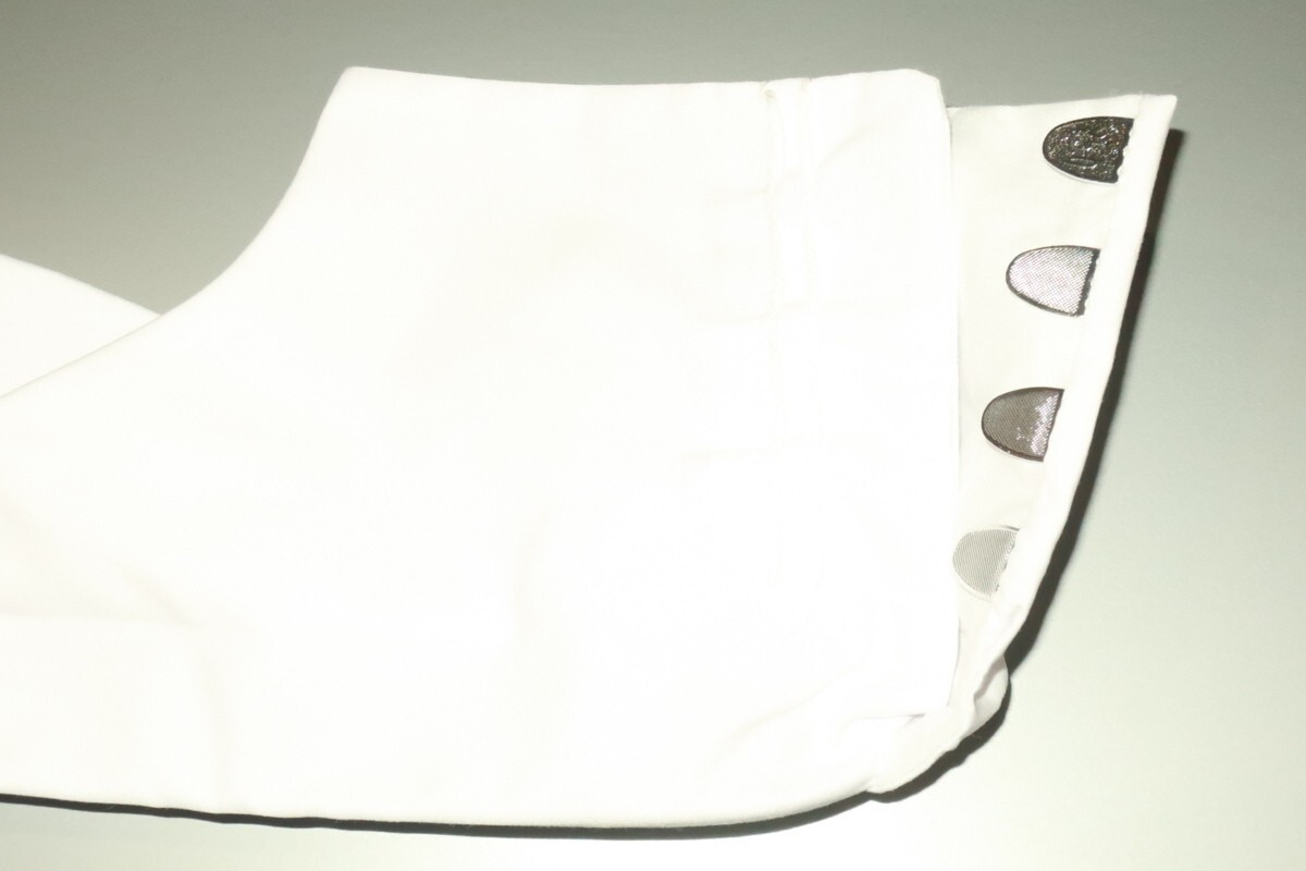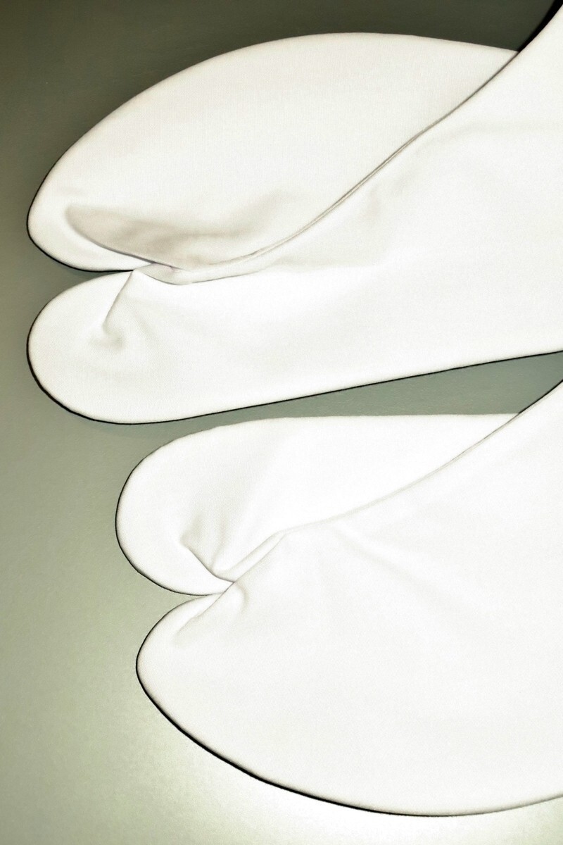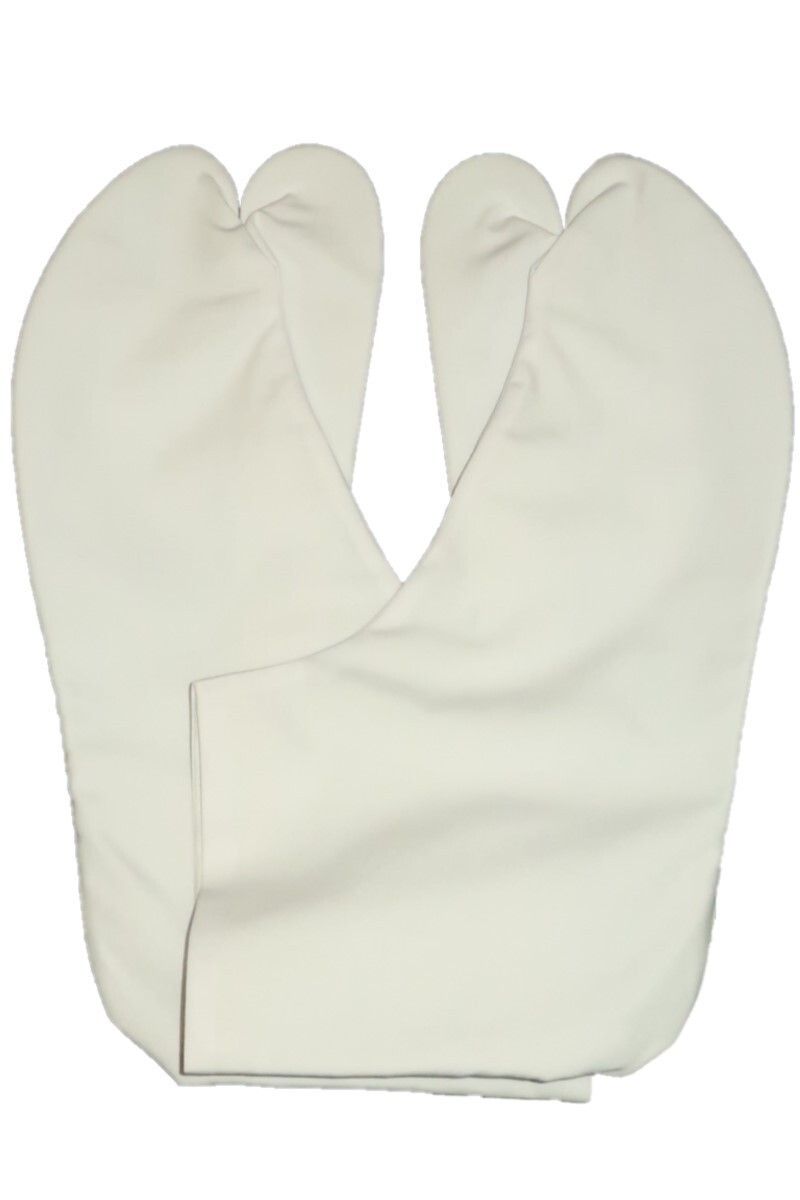■こちらの白足袋は、表地を糸の段階から木綿にポリエステル65%を織り交ぜ、経糸110本、横糸76本の密度で織り上げた生地を使いました。そのため、生地感に光沢を持たせ、また化繊が入ったことで皺になりにくく、いわゆるノー・アイロンを目指したものです。底生地は木綿100%のため、滑ることもなく、通常の履き心地を保持しつつ、手入れを便利にしたものです。