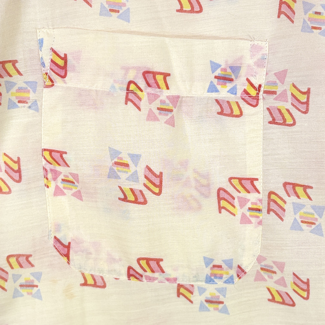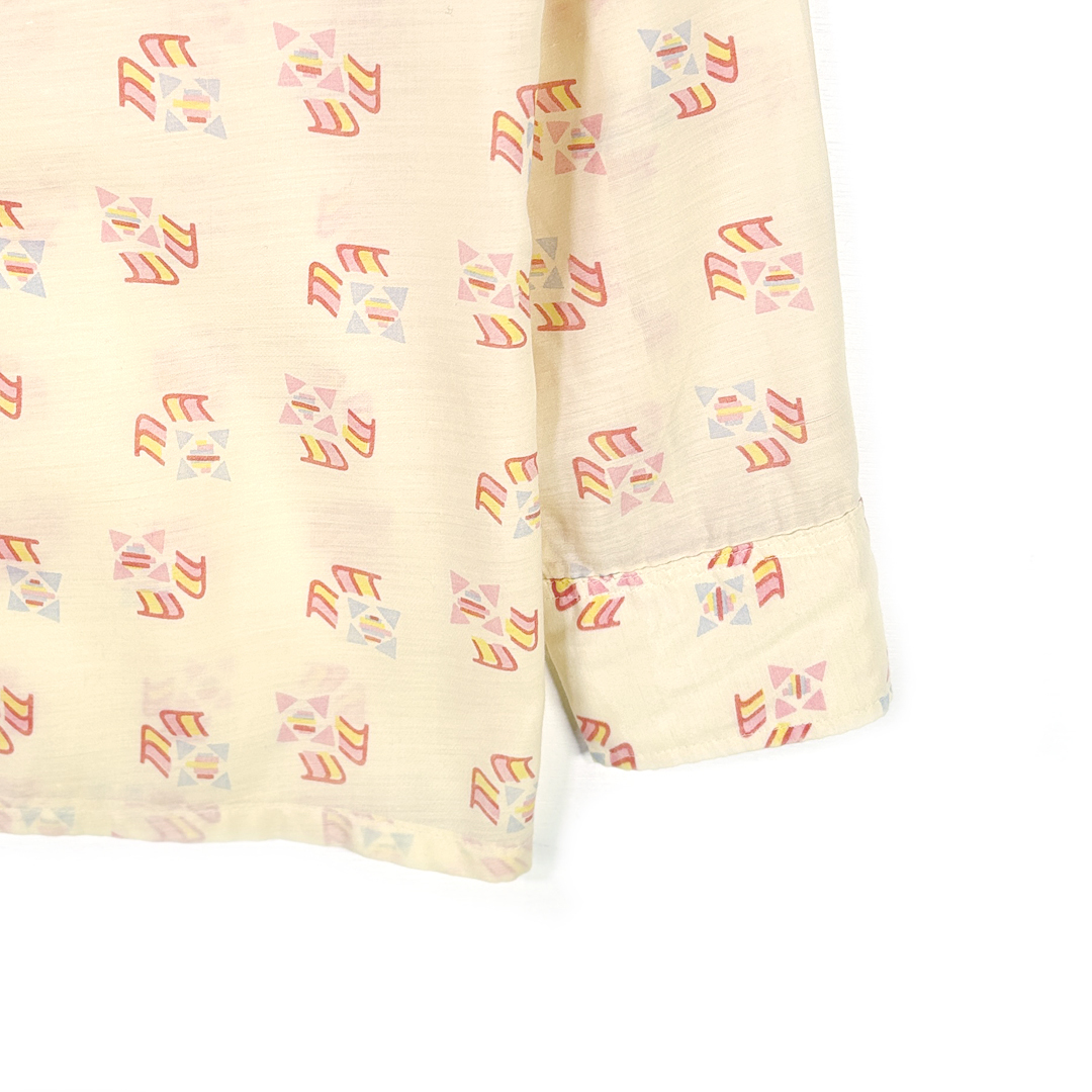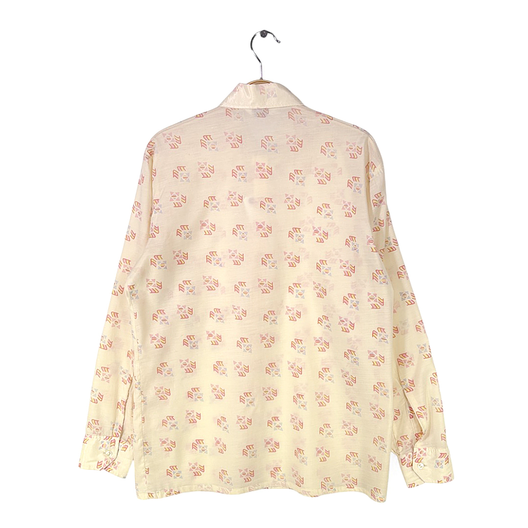 【送料無料】70s FEKON ヴィンテージポリシャツ 総柄 ユーロヴィンテージ 薄ベージュ ボックス型 ポリエステルシャツ M相当 古着 CA9025