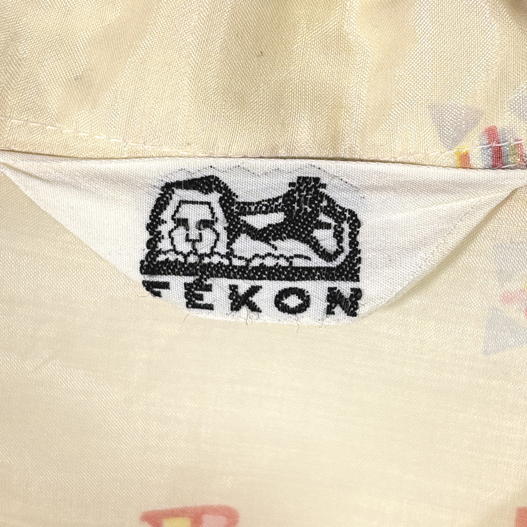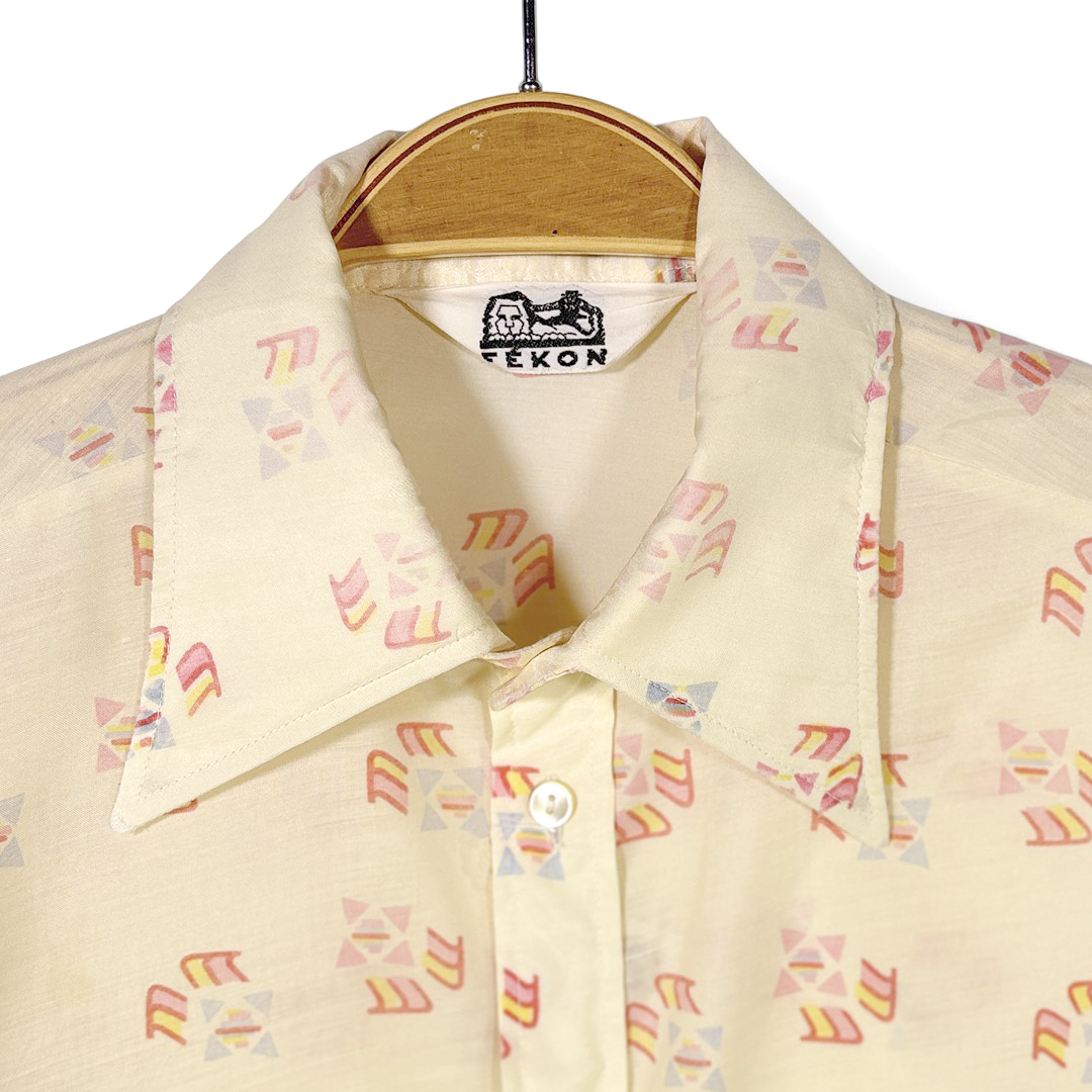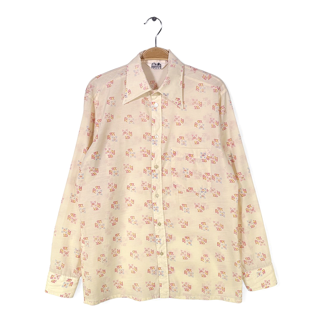 70s FEKON ヴィンテージポリシャツ 総柄 ユーロ 薄ベージュ ポリエステルシャツ サイズM相当 古着 CA9025