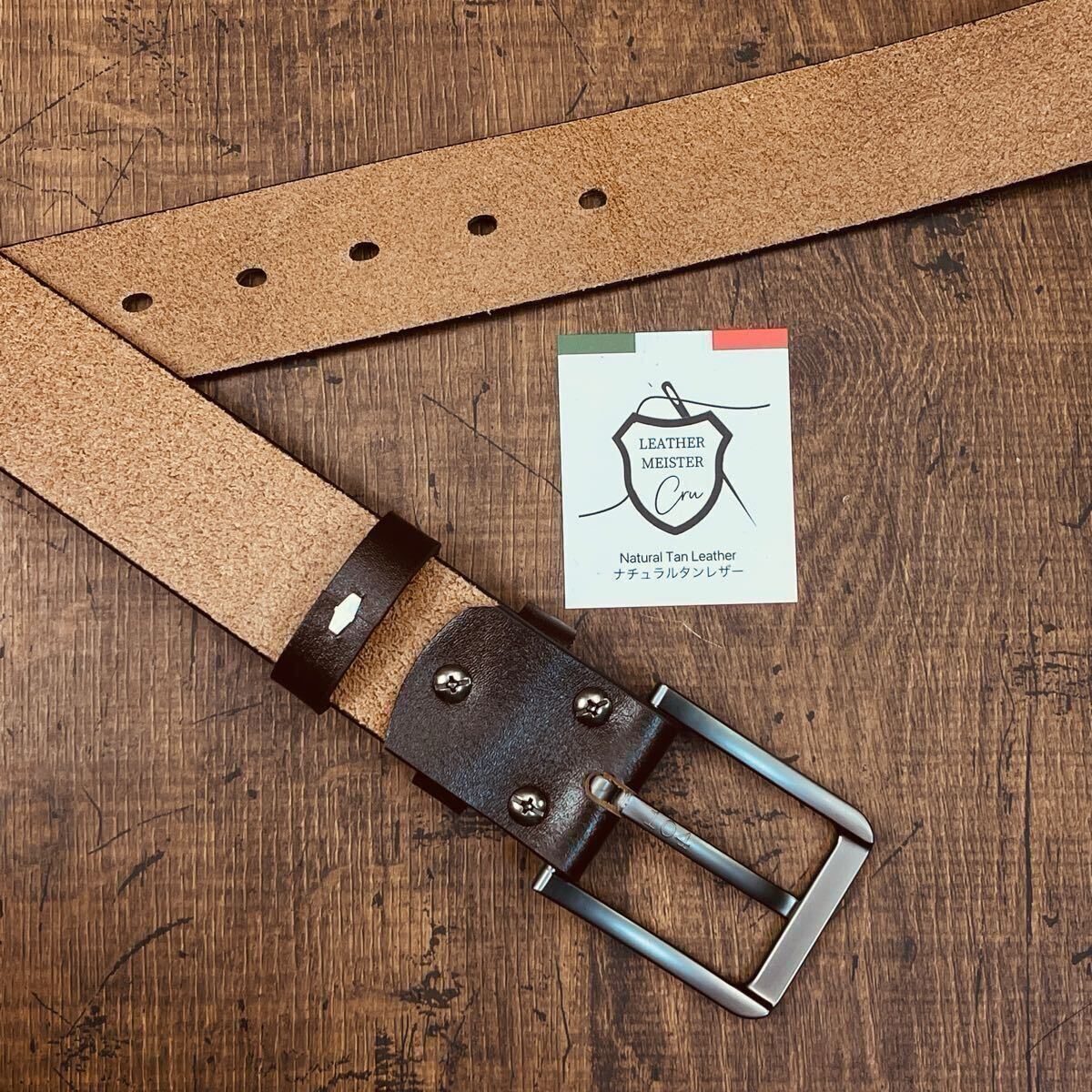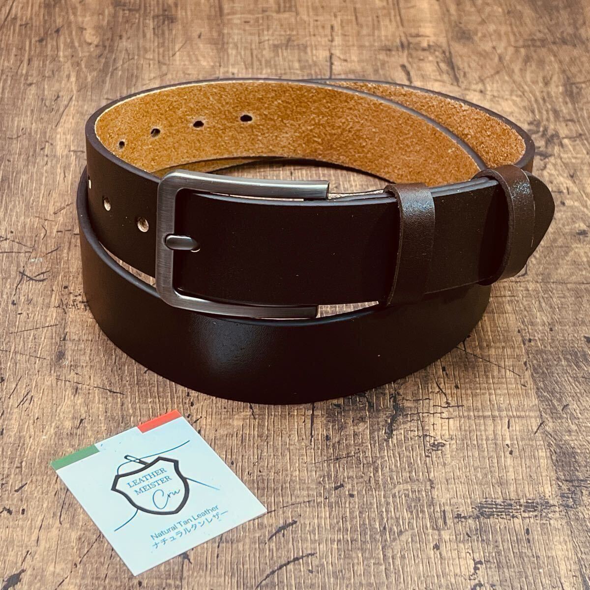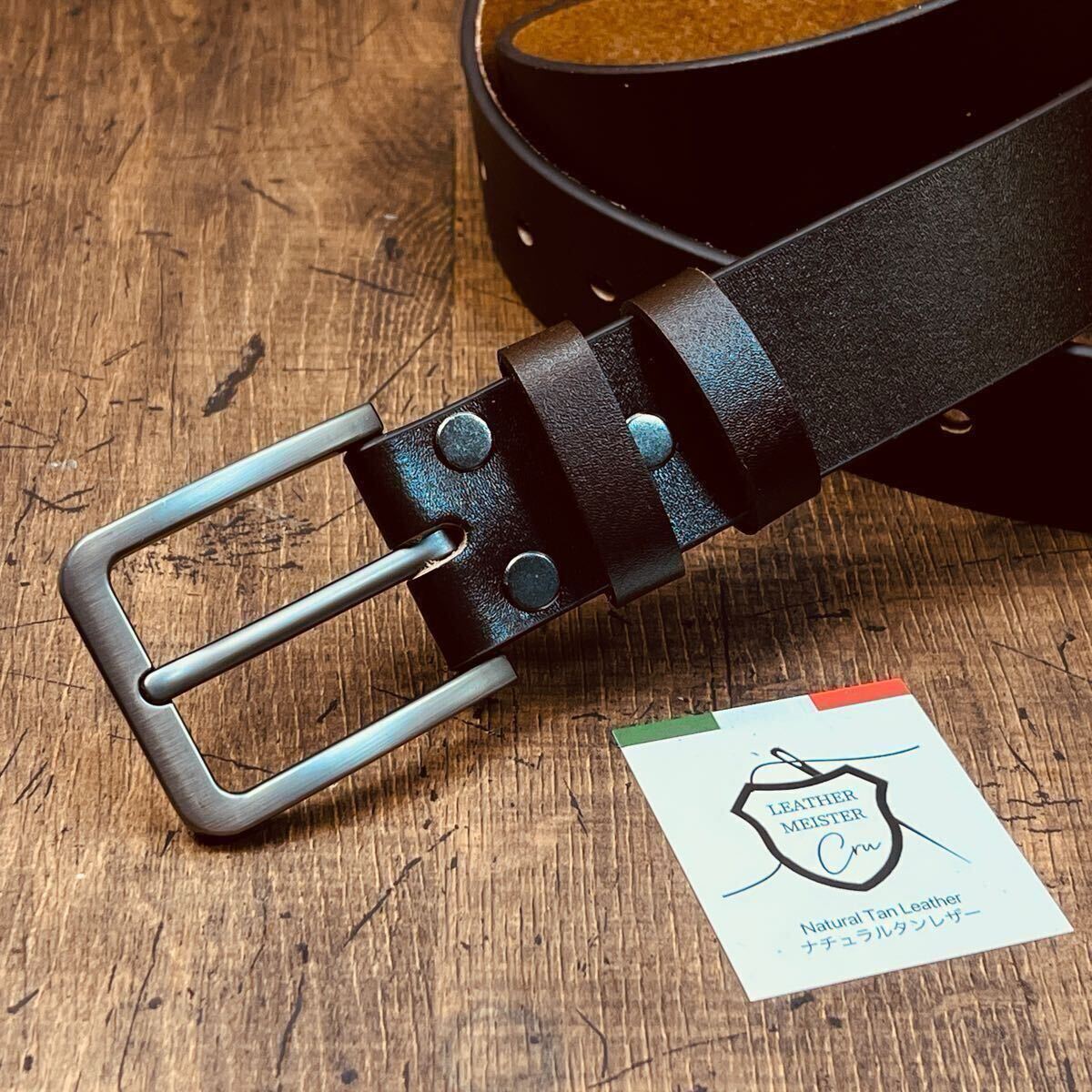 本革の醍醐味であるエイジングが存分に楽しめるナチュラルヌメ革を使用したレザーベルトです。使えば使うほどに味が出てきます。しっかりとした厚みで作られた重厚なガンメタブラック色のバックルが高級感を与えます。