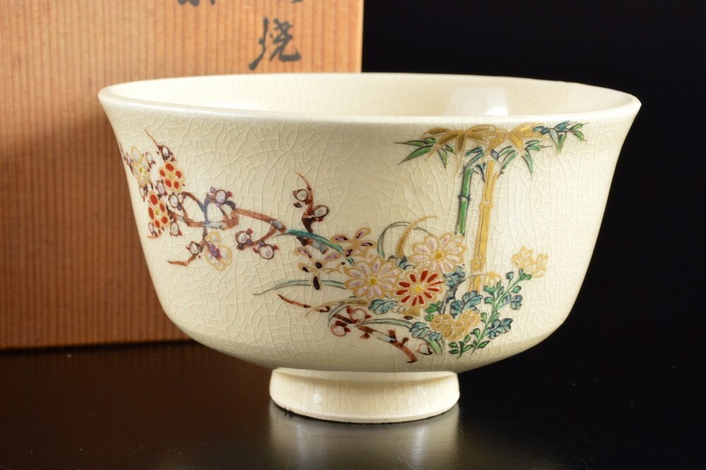 | 商品名 | 【雲】某名家委託品 薩摩 色絵金彩花絵付抹茶碗 在銘 共箱 古美術品(茶道具) H6264 |