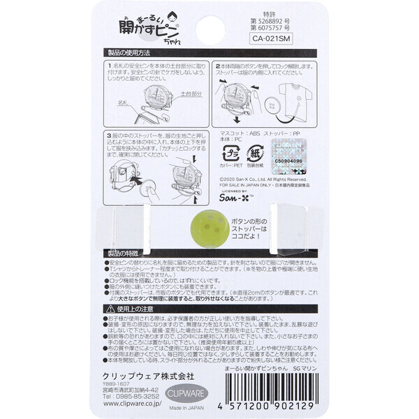 服に穴をあけないで名札を付けられる★ 名札用。 安全ピンの替わりに名札を服に留めるための製品です。 針を刺さないので服に穴が開きません。 ・Tシャツからトレーナー程度まで取り付けることができます。 (※冬物の上着や極端に硬い生地の衣服には使用できません。) ・ロック機能を搭載しているので、はずれにくいです。 ・服の外側に縫い付けたボタンにも装着できます。 ・付属のストッパーは、市販のボタンでも代用できます。 (※直径2cmのボタンが最適です。 これより大きいボタンで無理に装着すると、取り外せなくなることがあります。) 個装サイズ:80X140X18mm 個装重量:約10g 内容量:1個入 製造国:日本 【発売元:クリップウェア株式会社】 【品番】 CA-021SM 【材質】 マスコット:ABS 本体:PC ストッパー:PP 【使用方法】 (1)名札の安全ピンを本体のリボン部分に取り付けます。 安全ピンの針でケガをしないよう、しっかりと留めてください。 (2)本体両端のボタンを押してロック解除します。 ストッパーは服の内側に入れてください。 (3)服の中のストッパーを、服の生地ごと押し込むように本体の中に入れ、本体の上下を押して服を挟み込みます。 「カチッ」とロックするまで、確実に閉じてください。 【使用上の注意】 ・お子様が使用される際は、必ず保護者の方が正しい使い方を指導して下さい。 ・破損・変形の原因になりますので、無理な力を加えないで下さい。 装着したまま、乱暴な遊びはしないで下さい。 破損・変形した場合は、ただちに使用を中止して下さい。 ・誤飲等の恐れがありますので、口の中には絶対に入れないで下さい。 また、小さなお子さまの手の届くところに置かないで下さい。 (推奨使用年齢5歳以上) ・布の質や厚さによってはご使用になれない場合があります。 しわや伸びが気になる衣服には使用しないでください。 毎日同じ位置ではなく、少しずらして装着することをお勧めします。 ・本体を開放している時、スライド部分が外れることがありますので紛失しない様ご注意ください。 注意事項 ※予告なく成分・パッケージが変更になることがございます。 予めご了承ください。 *予告なく成分・パッケージが変更になることがございます。予めご了承ください *ダンボールを使用して発送する場合には、入数以下の個数の場合、 中古ダンボールを使用する場合があり、ご注文の商品とは異なるダンボールになる場合があります。 あらかじめ、ご了承ください。 |
