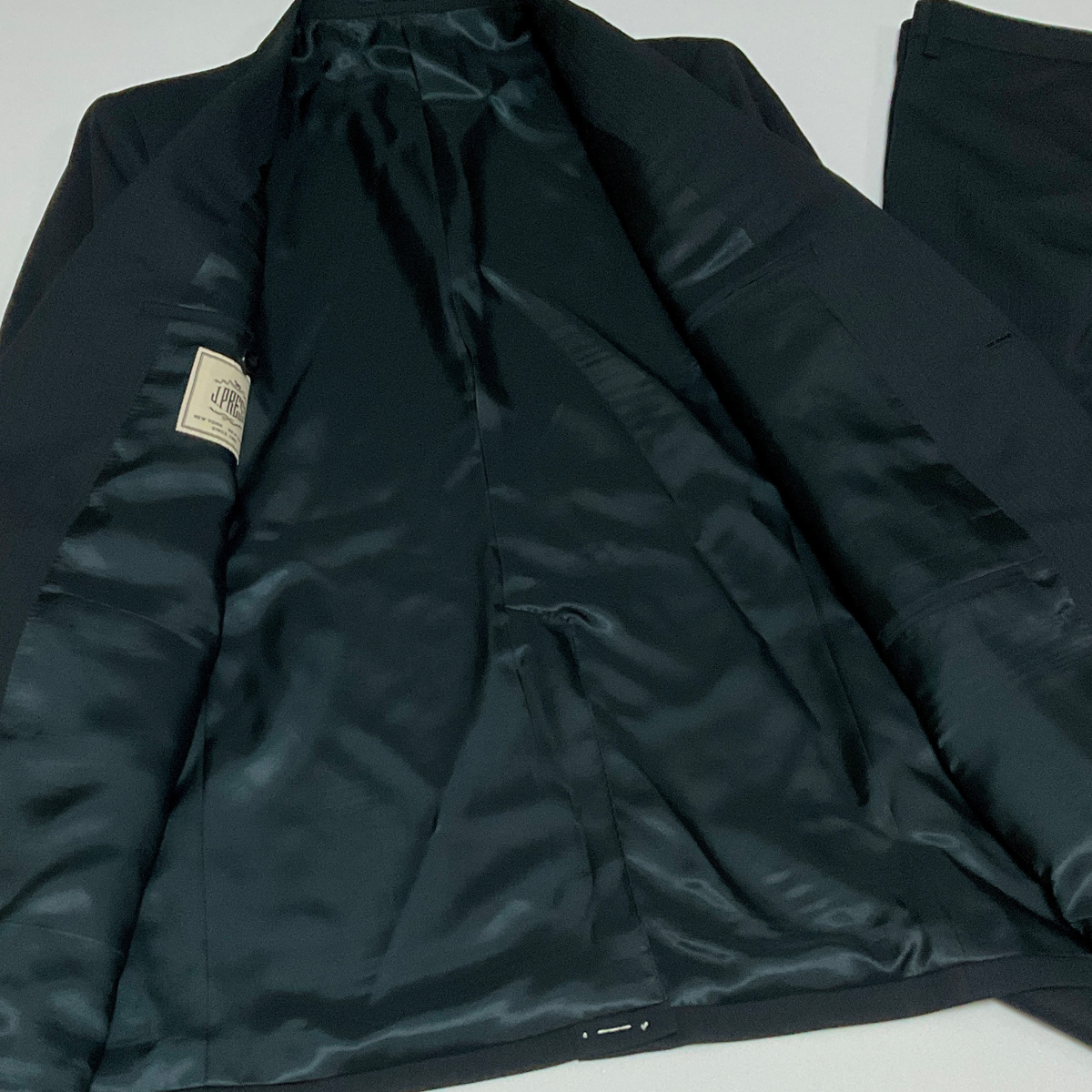 高い縫製技術と丁寧な仕立ての日本製です。 ジャケットには、フロントボタン2個、カフスボタン4個。ポケットは外側に胸ポケットを含め3つ、内側に右1つ、左に2つ付いています。スラックスは、ウエストあたりをすっきりと見せてくれるノータック仕様。 センターベント、裏地は総裏仕立てになっています。衿は、非常に時間と手間と技術が求められる一枚衿で仕立てています。 上質なウールにポリエステルをブレンド。少し薄手でサラッとした滑らかな肌触り。約0.4㎝幅の細かいコードストライプ柄で上品な光沢がエレガントな印象を醸し出している一着となっています。 ビジネスシーンはもちろん、様々なシーンで活躍していただけます。 | ||||||||||||||||