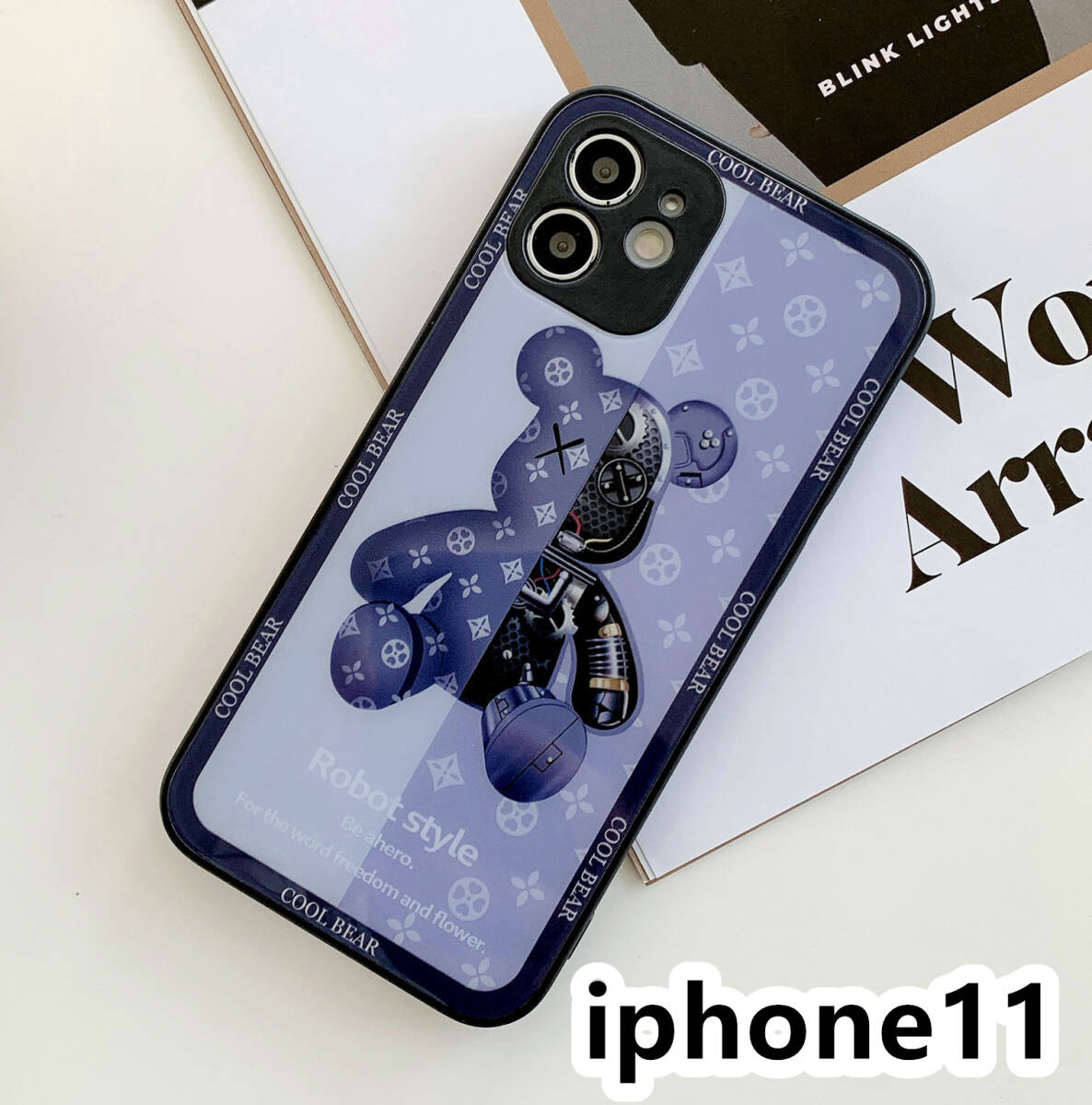 iphone11ケース カーバー TPU 可愛い 熊 ガラス お洒落 軽量 ケース 耐衝撃高品質ブルー