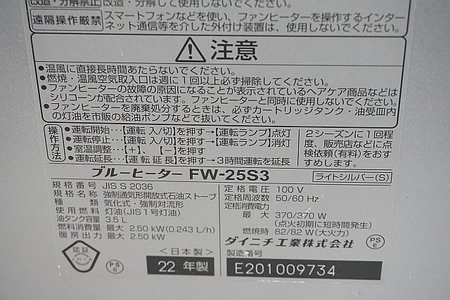 ●◎ DAINICHI ダイニチ ブルーヒーター 石油ファンヒーター 3.5Lタンク付(青キャップ) 100V 2022年製 ※動作確認済み FW-25S3 ●