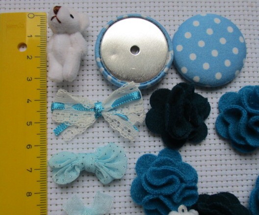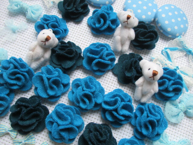A25◆青・水色◆フエルト花 18個*Bare 4個*丸ボタン 4個・リボン型モチーフ 16個
