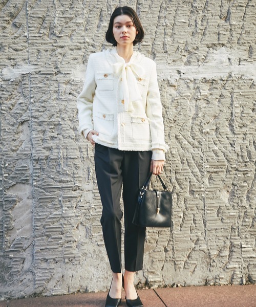 参考商品名:3点セット!ノーカラーツイードジャケット&ボウタイリボンブラウス&テーパードパンツセットアップ