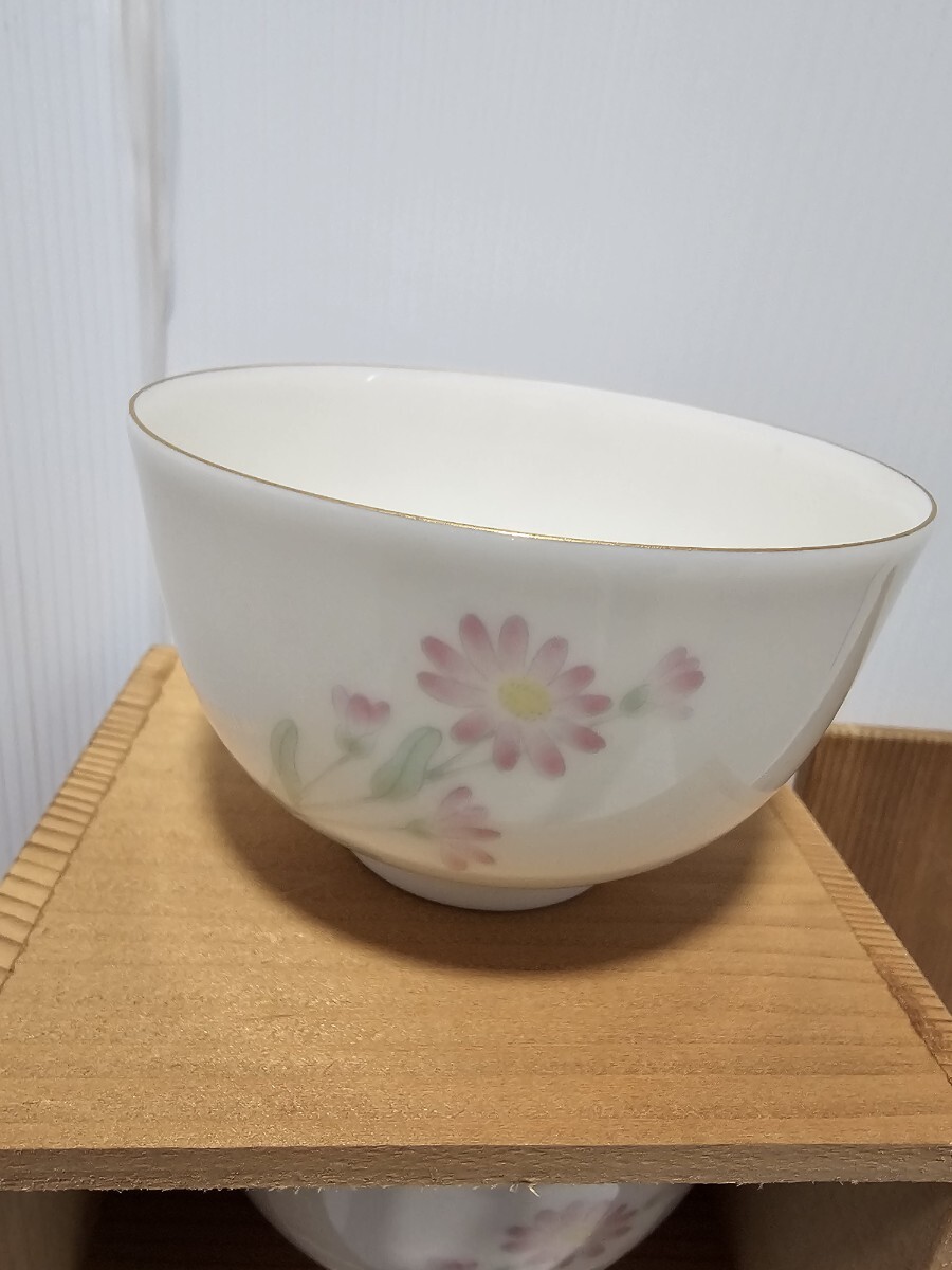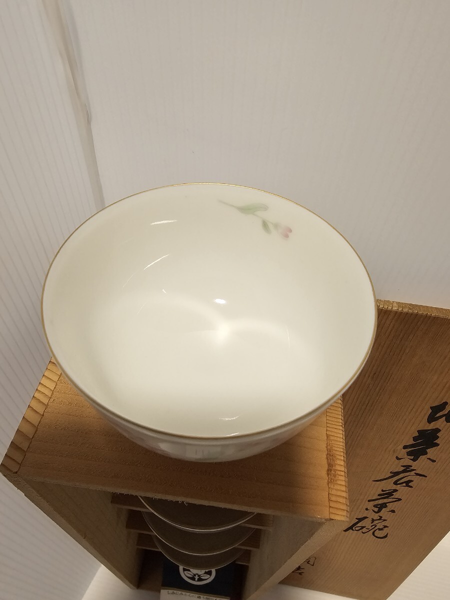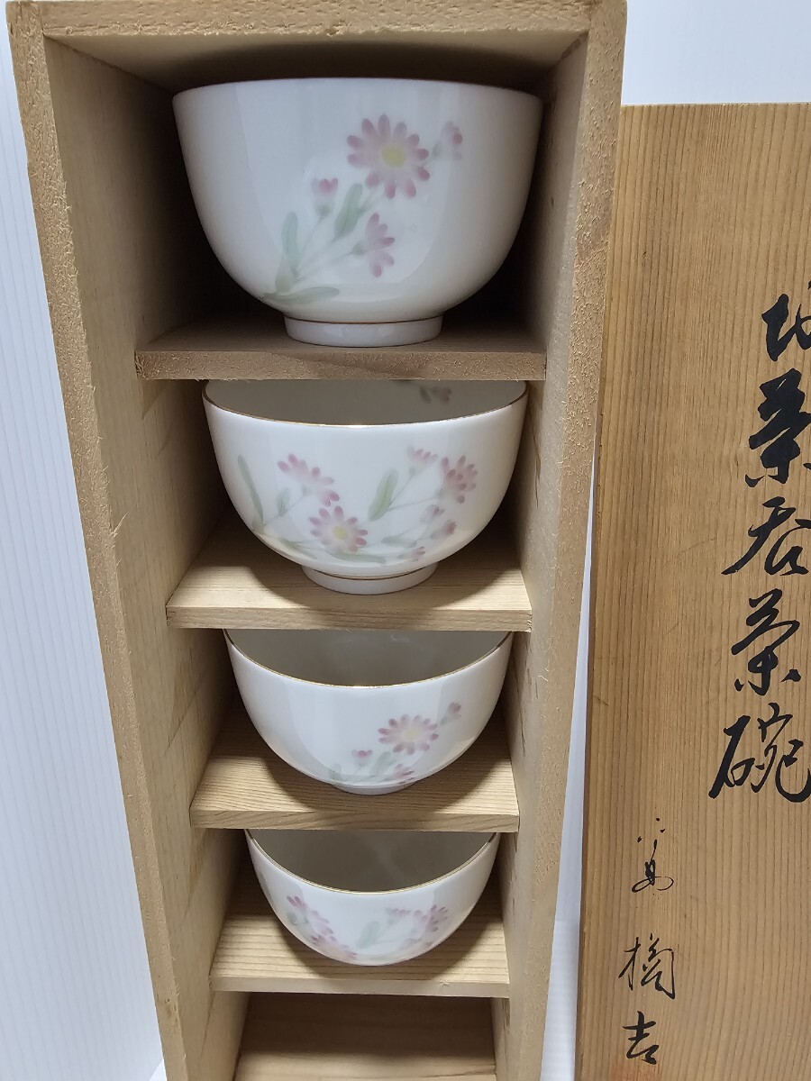 花柄デザインの陶器湯飲み5個セット、木箱付き。