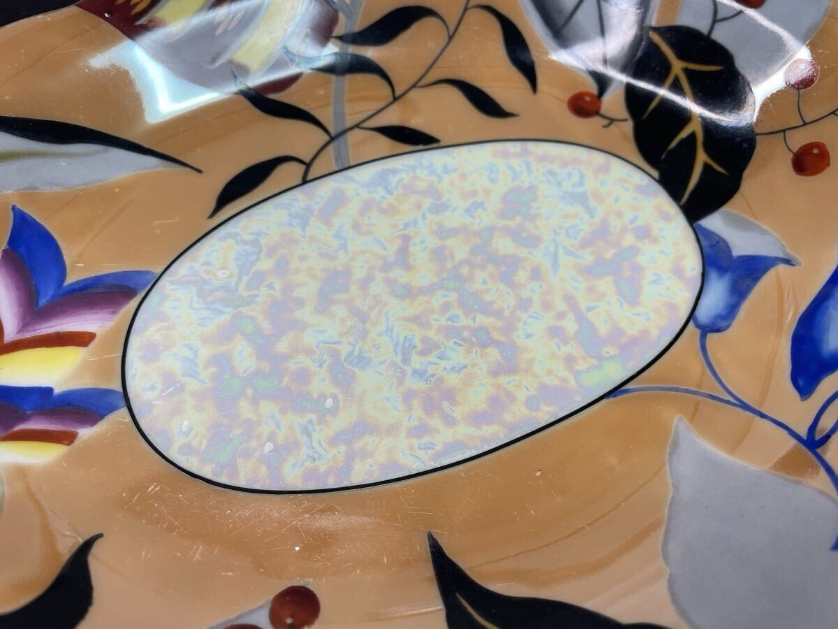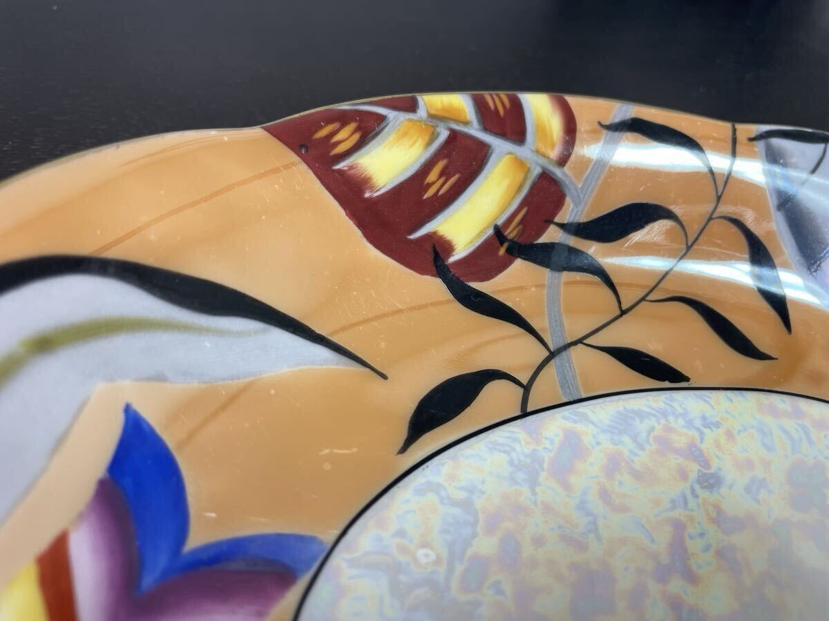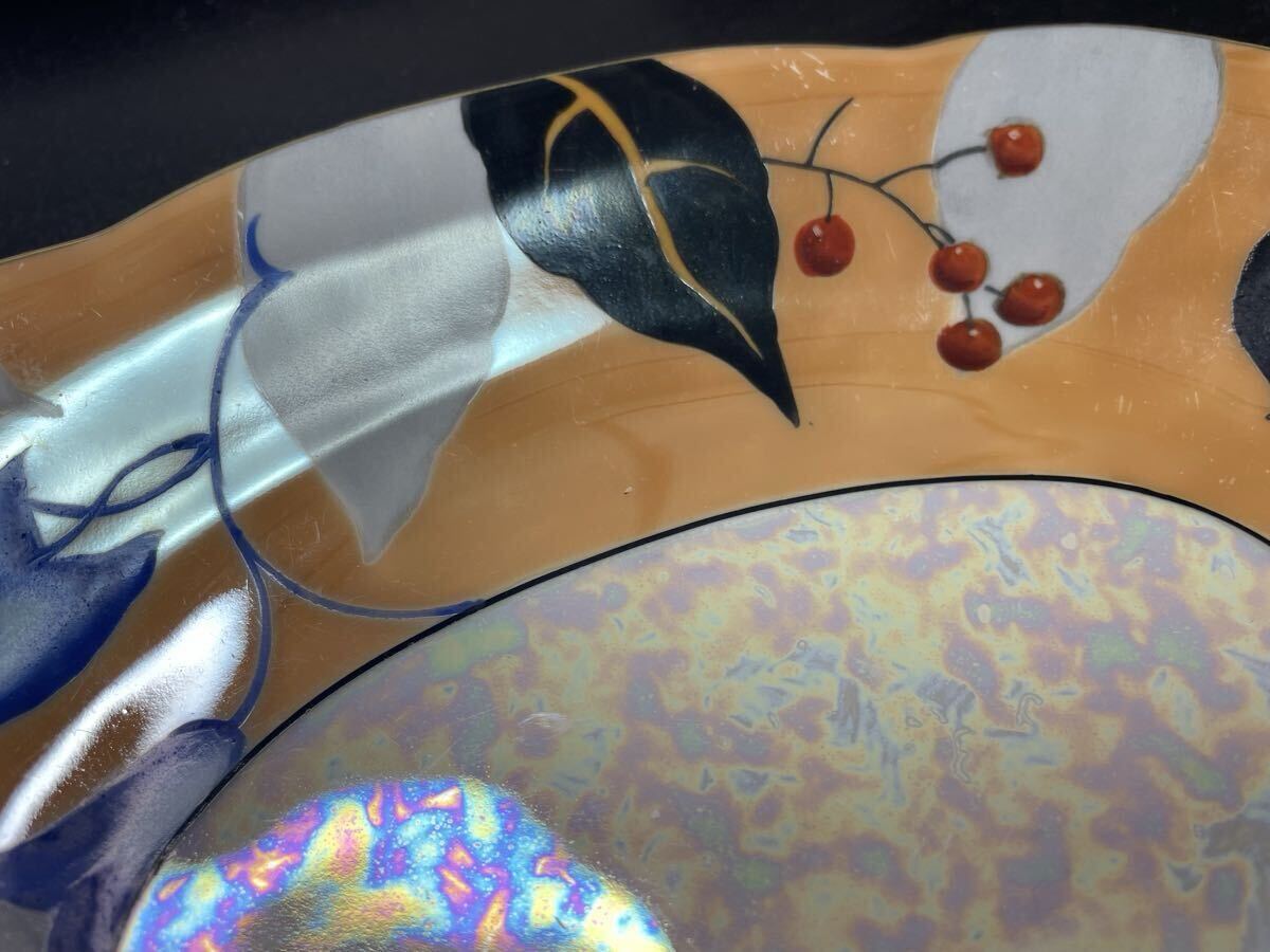 中央には、ノリタケの得意とする**ラスター彩(Lusterware)**が施され、玉虫色に輝く幻想的な光沢を放っています。この技法は、視線や光の角度によって色が変化するのが魅力です。