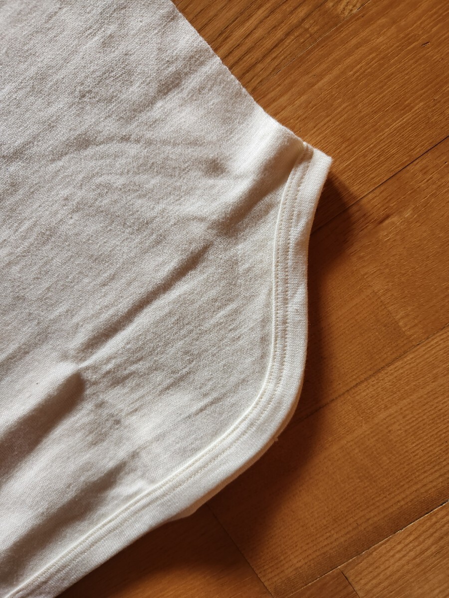 12番のムラ糸で独特の陰影が出るように編まれたこの生地はシャドウボーダーと呼ばれており、無地でありながらうっすらと横段のようなムラが浮かびます。
