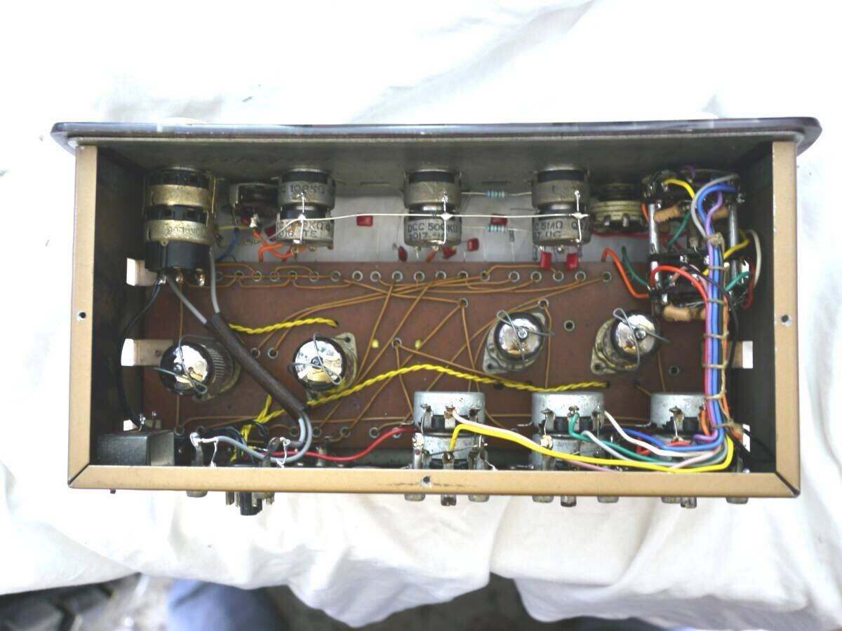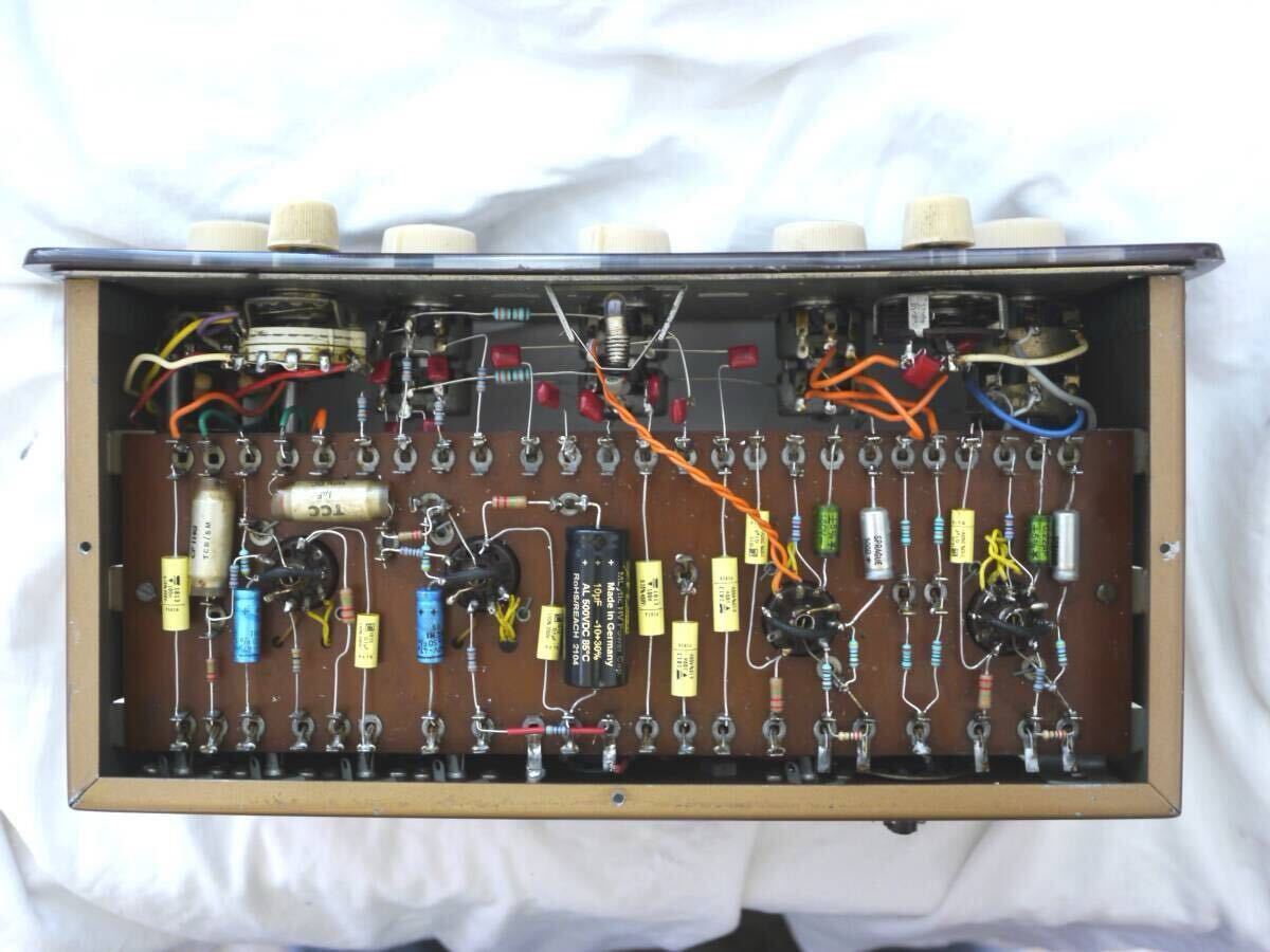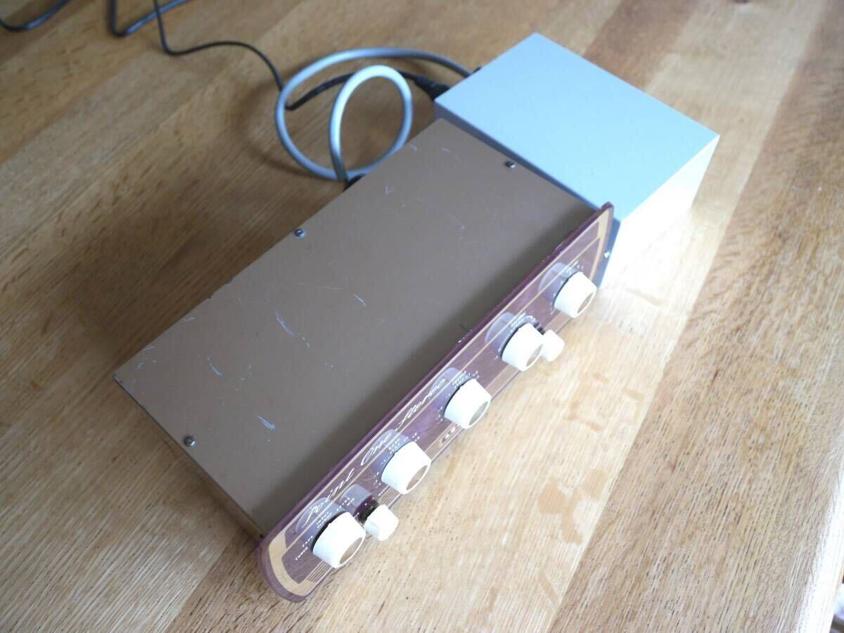 | 商品紹介 | Leak Point One Stereo Preamplifierのレストア(整備)済のユーズドと専用電源です。 ジャンクのアンプ本体を入手し、レストアし専用の電源を作製してしばらく使用しておりました。 (入手時点では、球無しで、球装着で通電すると盛大に発振するという状態でした。) 測定した周波数特性を載せておきます。 1.各特性(左右チャンネルとも)を測定し、動作に問題有りません。 2.電源は、フィラメントおよび+B電圧を精密安定化しており、電源由来のノイズもありません。 3.パネル右下のRUMBLE SWITCH(ロータリーSW)のストッパーが効きません。 ただ、クリック動作はしますので、表示位置は正しくあっています。 4.電源入力用のオクタルコネクタはオリジナルとは互換性がありません。 よって、本器をLEAKのパワーアンプに接続して使用することはできません。 5.その他、使用上の注意 ①変更点 ・プリアンプの出力は、「RECORD」のRCAジャックとしています。これにより本機本来の「RECORD」出力は無くなっています。 ・「OUTPUT R」のRCAジャックはダミーで、無接続です。(LEAK パワーアンプに接続するためのものと思われます。) ②本器は信号に必ず(可聴帯で影響する)CRの定数がくっついている設計で、特にトーンコントロール回路は必ず通過するうえ、トーンボリュームの中点でフラットとなるよう目指す設計のようです。 結果として、少なからず周波数特性はうねり、ボリュームのバラツキからトーンコントロールの零点目盛でフラットとはなりません。(厳密には) ここらは、QUADのトーンコントロールキャンセラがついているのと違います。 要は、ご自分の耳でよいところを見つけてくださいという、古い設計思想のアンプです。 ********************************** レストア内容その他(興味の無い方は読み飛ばしてください。) 1.電源について 本アンプは、多分、パワーアンプとセットで販売・使用されることを前提としていて、純正の専用電源はないと思いますが、WEBで公開されているアンプ回路図から必要電圧を見つけて作成しました。 2.レストアした回路について 本アンプについては、どうも2種類(ひょっとしたらそれ以上の)回路図が、存在するようです。 入手した時点で本器は、古いタイプでした。 レストアにあたり少し悩んで、2段目の増幅回路の帰還量の多い方を採用しました。 WEBでは、どちらが古い回路図だとか、どちらが音が良いとかという議論もあるようですが、大きな差はないはずです。 3、交換した電子部品で、抵抗・コンデンサは精度などオリジナルより良いものを採用しました。 |