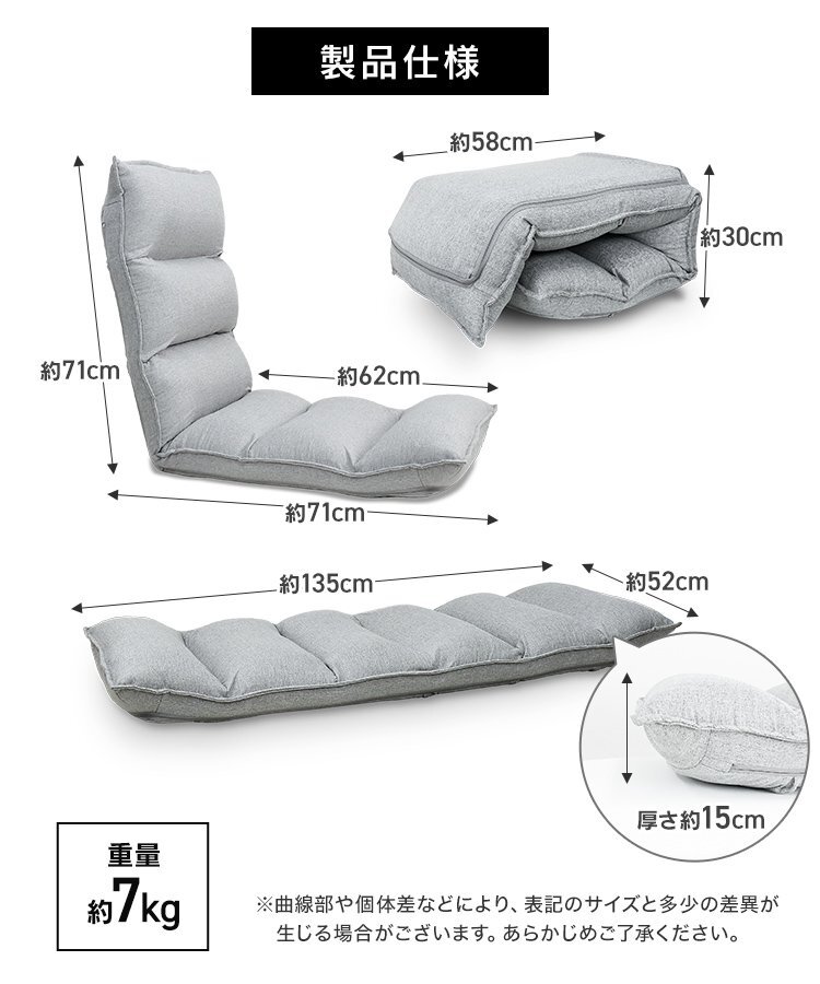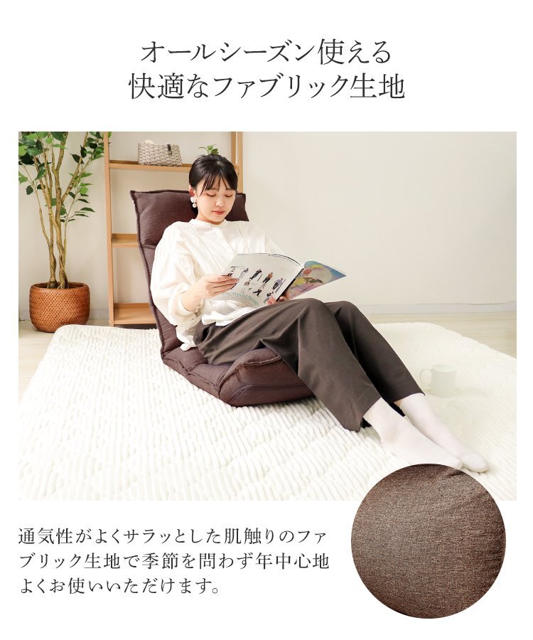 14段階リクライニング式!2,744通りの理想の角度で快適に。 全体にウレタン綿がたっぷり詰め込まれており、厚みは15cmとボリュームのある仕上がり。 適度な弾力でしっかりと身体を支え、ふわふわもこもこの快適な座り心地♪ シーンや用途に合わせてリクライニングを調節できます。 頭まで支えてくれるハイバック仕様♪長時間座っていても疲れにくいです。 お部屋に馴染み、オールシーズン使えます。 お尻が乗る部分にパイプを使用していません! お客様のレビューをもとに座り心地を第一に考え、座面中央にパイプを必要としない構造にしました。 大事な内部ギアは、世界でも活躍する実績ある日本メーカー「KoYo」の日本製! コンパクトに折りたためるので持ち運びや収納にも便利です。 ワンルームや一人暮らしの方にオススメ! 圧迫感なく、お部屋も広く感じるサイズです。 【商品仕様】 ・カラー:ブラウン ・サイズ:(約)幅52×奥行71×高さ71cm/座面厚み:(約)15cm ・重量:(約)7kg ・材質:鉄パイプ/生地:リネン 【注意事項】 ・この商品はカバーリングではありません(洗濯不可) ・生産ロットが違う場合、柄・色味が若干変わってくる場合がございます。 ・商品を使用して発生した事故・トラブル・破損等につきましては一切の責任を負いかねます。 ・商品は、モニターによって色合いが異なって見える場合があります。 ・仕様・デザインは改良のため予告なく変更することがあります。 |