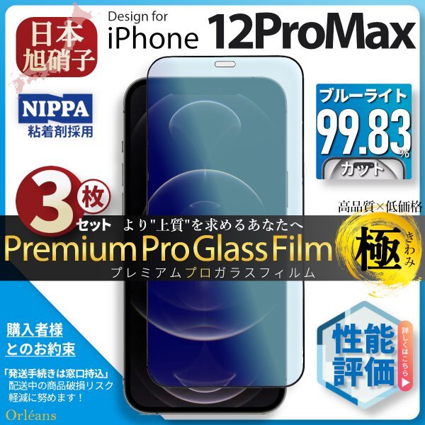 iPhone 12 ProMax ブルーライトカット 強化ガラスフィルム 超得3セット 旭硝子 全面保護 自動吸着 保護フィルム 液晶保護フィルム