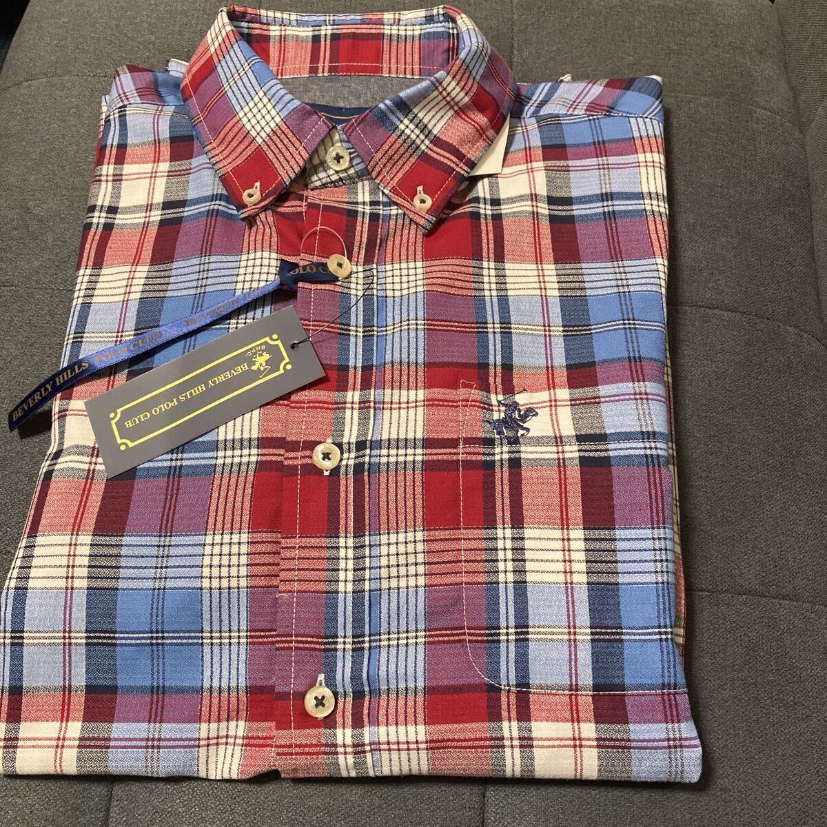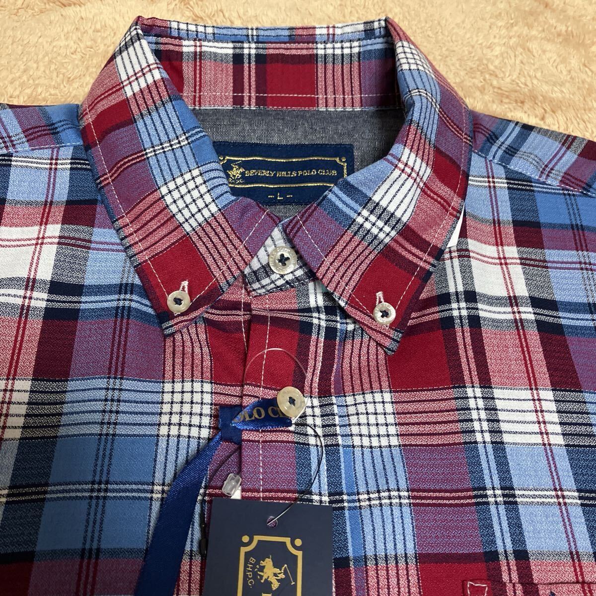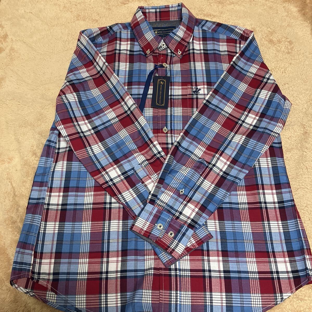 新品、タグ付き、長袖ボタンダウンシャツ、Lサイズ、チェック柄、前ポケット有り、胸囲96-104cm、素材ポリエステル65%、綿35%。袖丈60cm、着丈75cm。誕生日、クリスマス、敬老の日、父の日にどうぞ。送料無料。