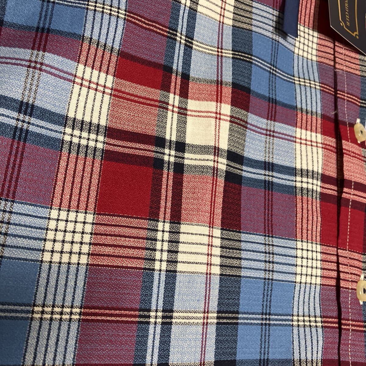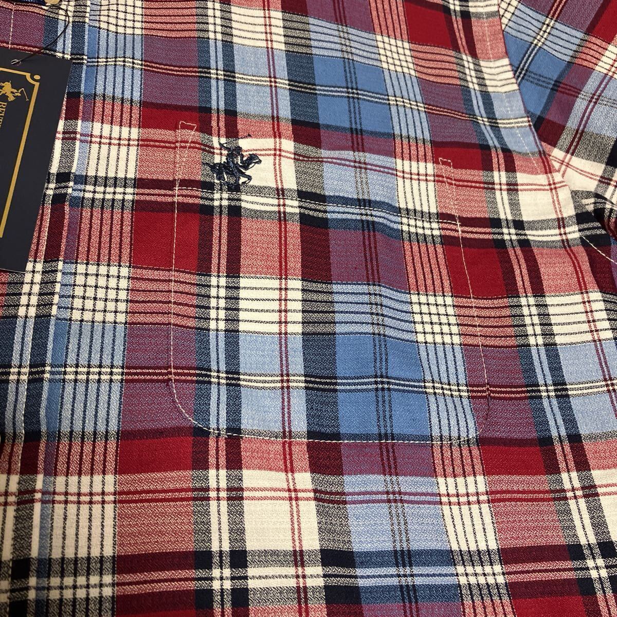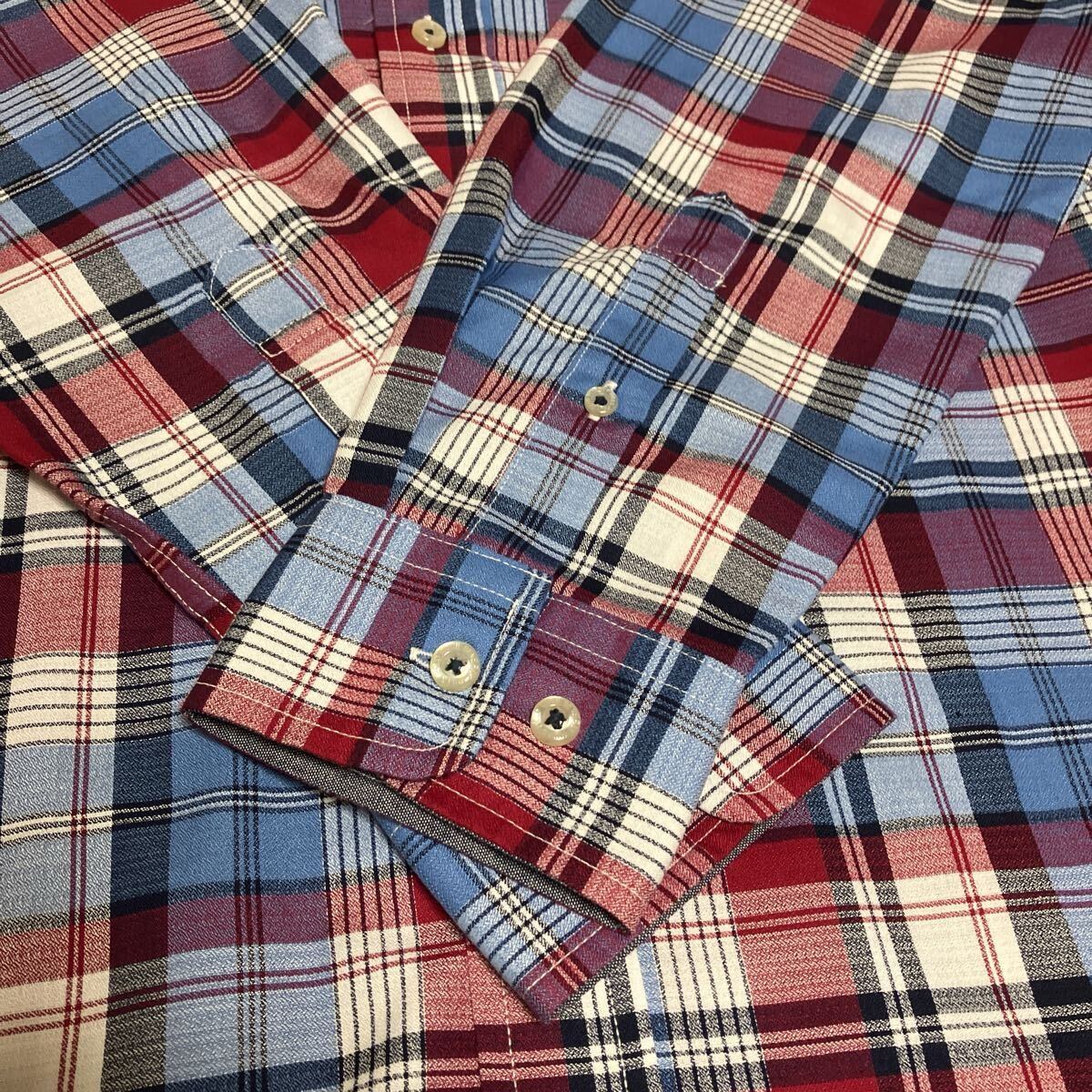 新品、タグ付き、長袖ボタンダウンシャツ、Lサイズ、チェック柄、前ポケット有り、胸囲96-104cm、素材ポリエステル65%、綿35%。袖丈60cm、着丈75cm。誕生日、クリスマス、敬老の日、父の日にどうぞ。送料無料。