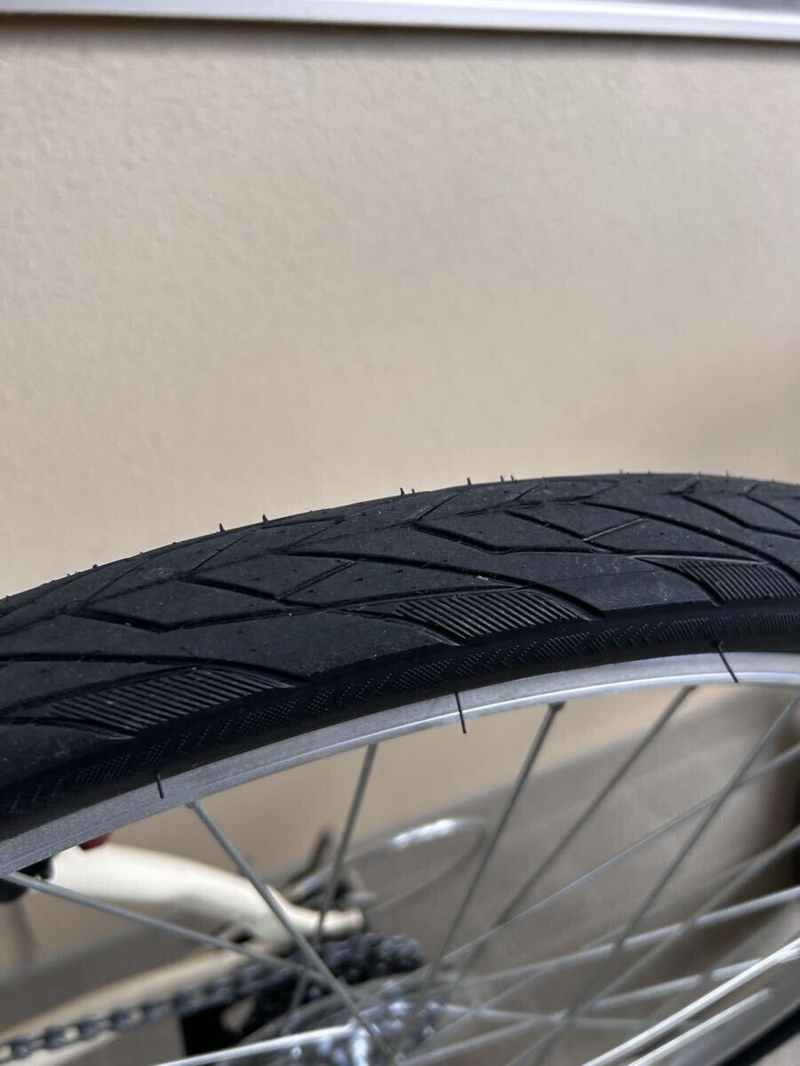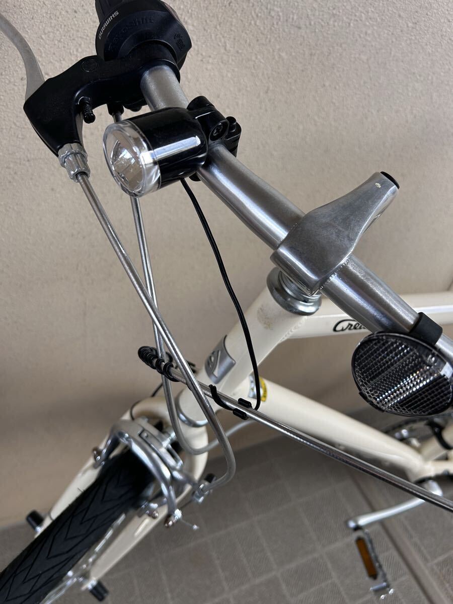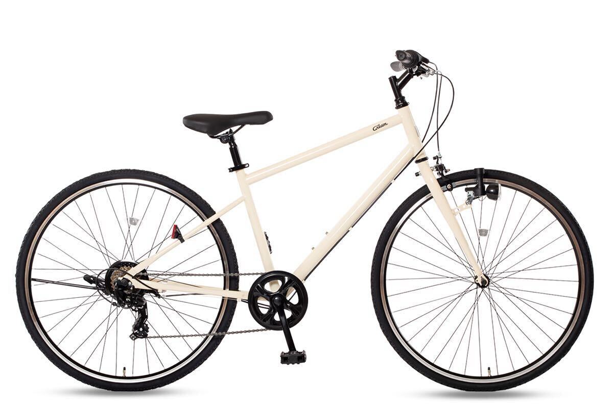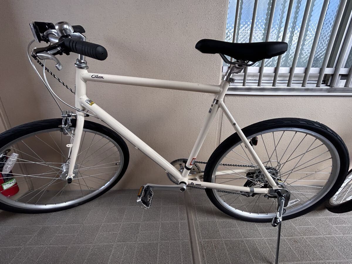 クリーム色のアルミフレーム、26インチタイヤ、7段変速、オートライトのクロスバイクです。