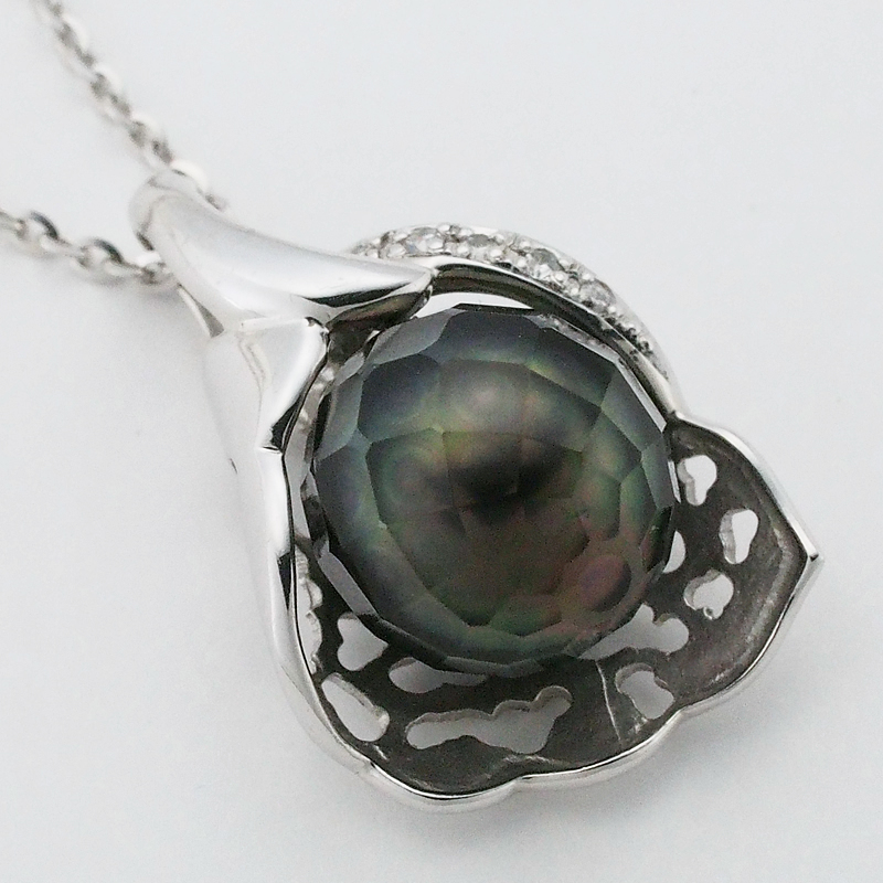 特殊研磨が施されたパールとダイヤモンドで飾り立てたホワイトゴールド製のデザインネックレスです。チェーンはスライドアジャスター付きでお好みの長さに調節可能です。