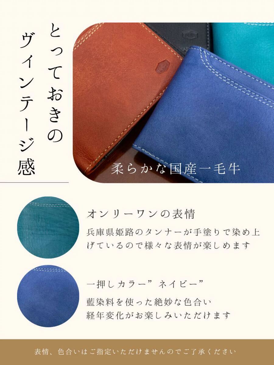 ●柔らかな国産一毛牛を兵庫県姫路のタンナーが手塗りで仕上げたビンテージ感と絶妙な発色が特徴のお財布です。全色統一の黒の内装革もソフトでカードの出し入れもストレスなく出来ます。