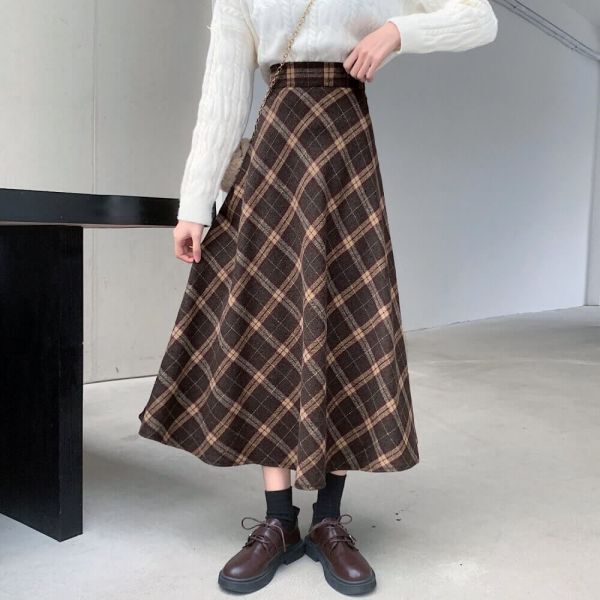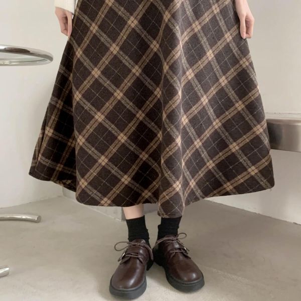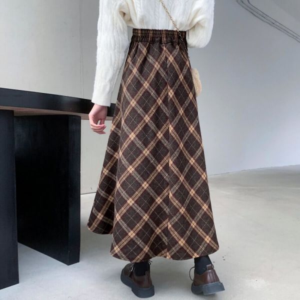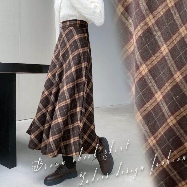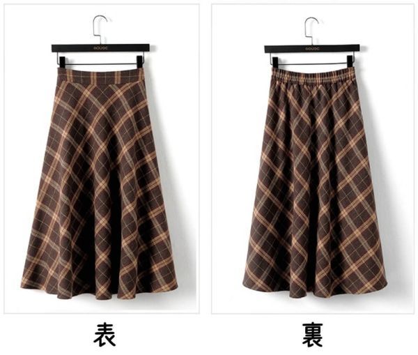 【毎日当日発送】 チェック柄 スカート ミモレ丈 ロング丈 裏地あり レトロカラー ブラウン ウエストゴム Aライン 総柄 送料無料