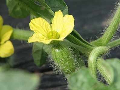 一親蔓より、3~4子蔓を選定、自然授粉でも一子蔓に1果が容易に着果し、余分な着果を