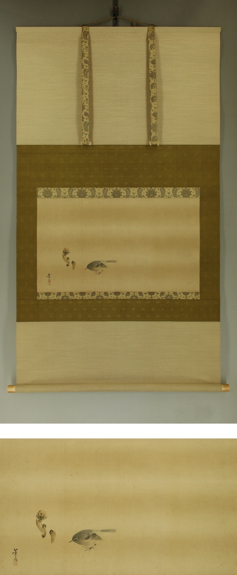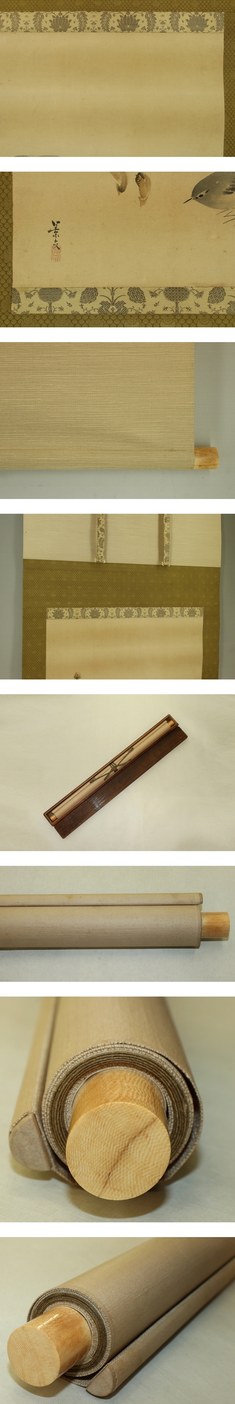 松村景文 まつむら-けいぶん(1779-1843) 江戸後期の四条派の画家。京都生。呉春の末弟。 通称は要人、幼名は直治、字は子藻、号は華渓。 兄より絵の指導を受け、また円山応挙の写生風を学び一家を成す。 天保14年(1843)歿、65才。 本紙は、染み、汚れ、折れ、皺、ヤケがあります。 表装は、染み、汚れ、軽い折れ、皺、軸先に汚れとヒビがあります。 【サイズ】 作品 横約55cm×縦約32.5cm 表装 横約69.5cm×縦約125cm |