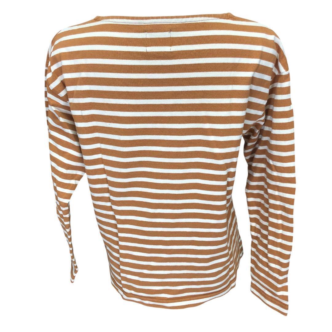 ブラウンとホワイトのボーダー柄・ボートネックの長袖Tシャツです。綿100%で肌触りが良いです。