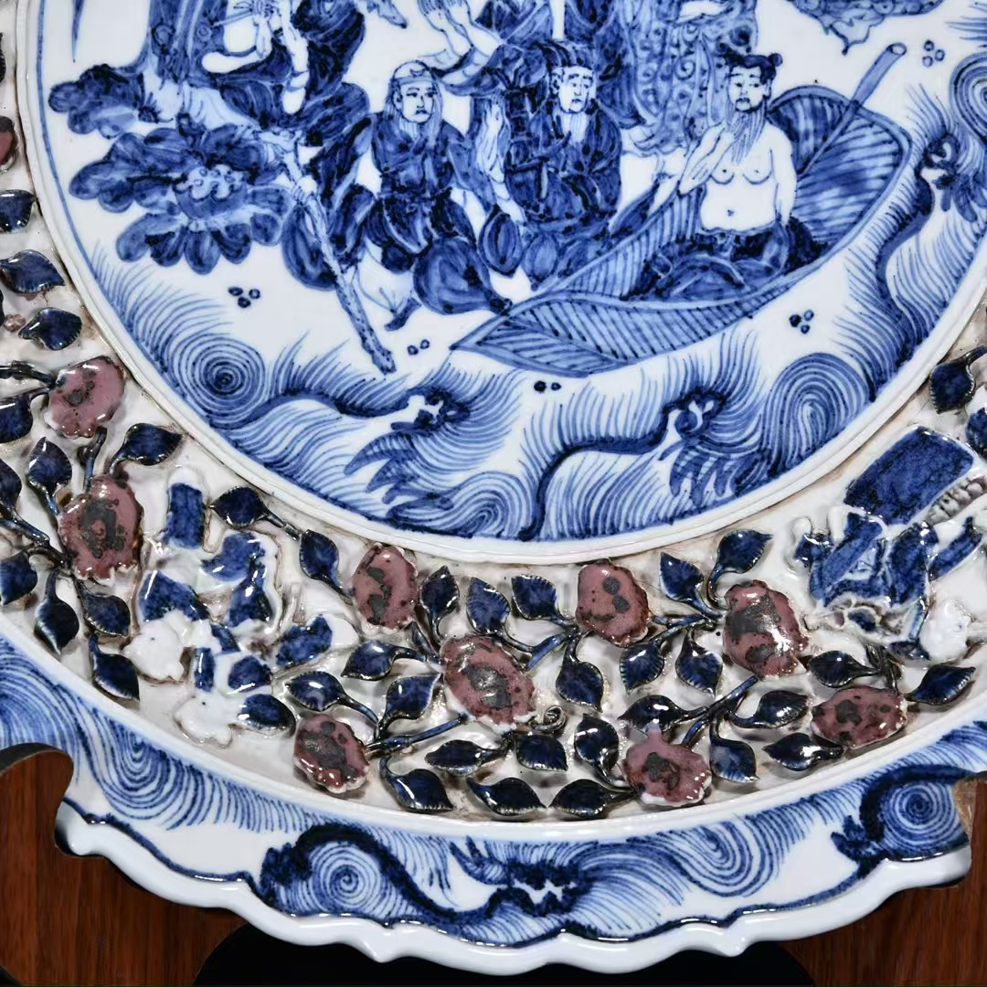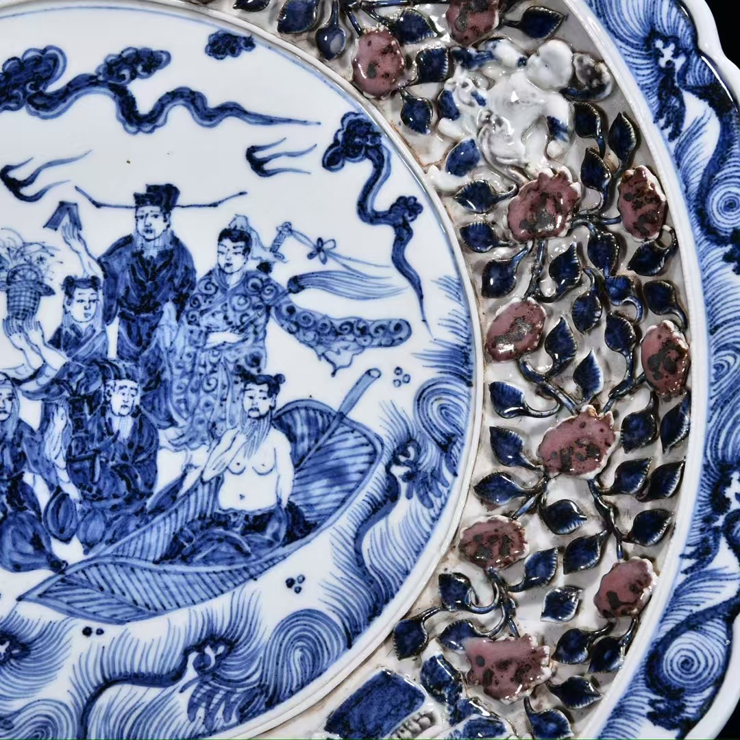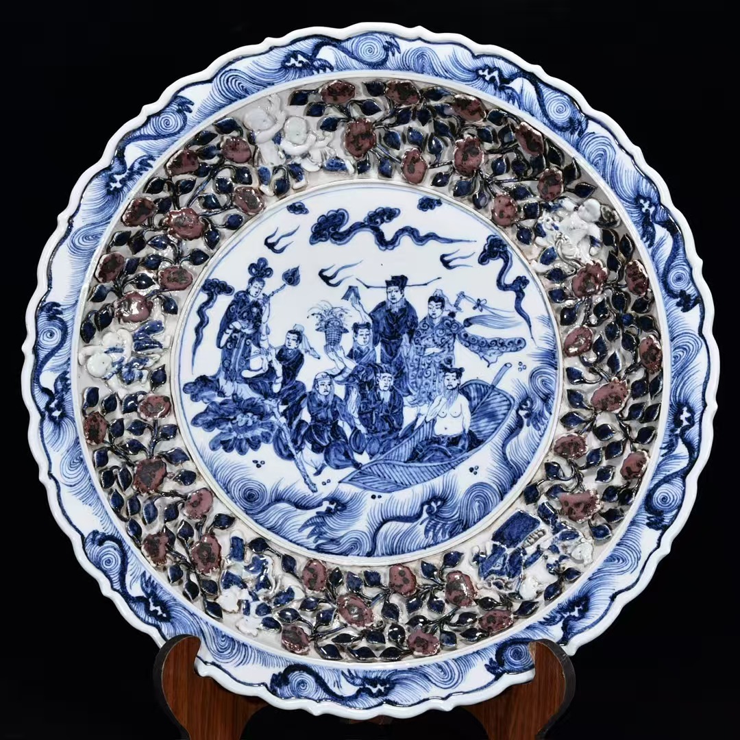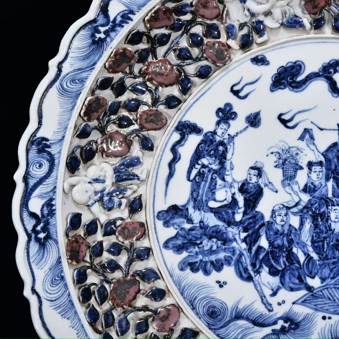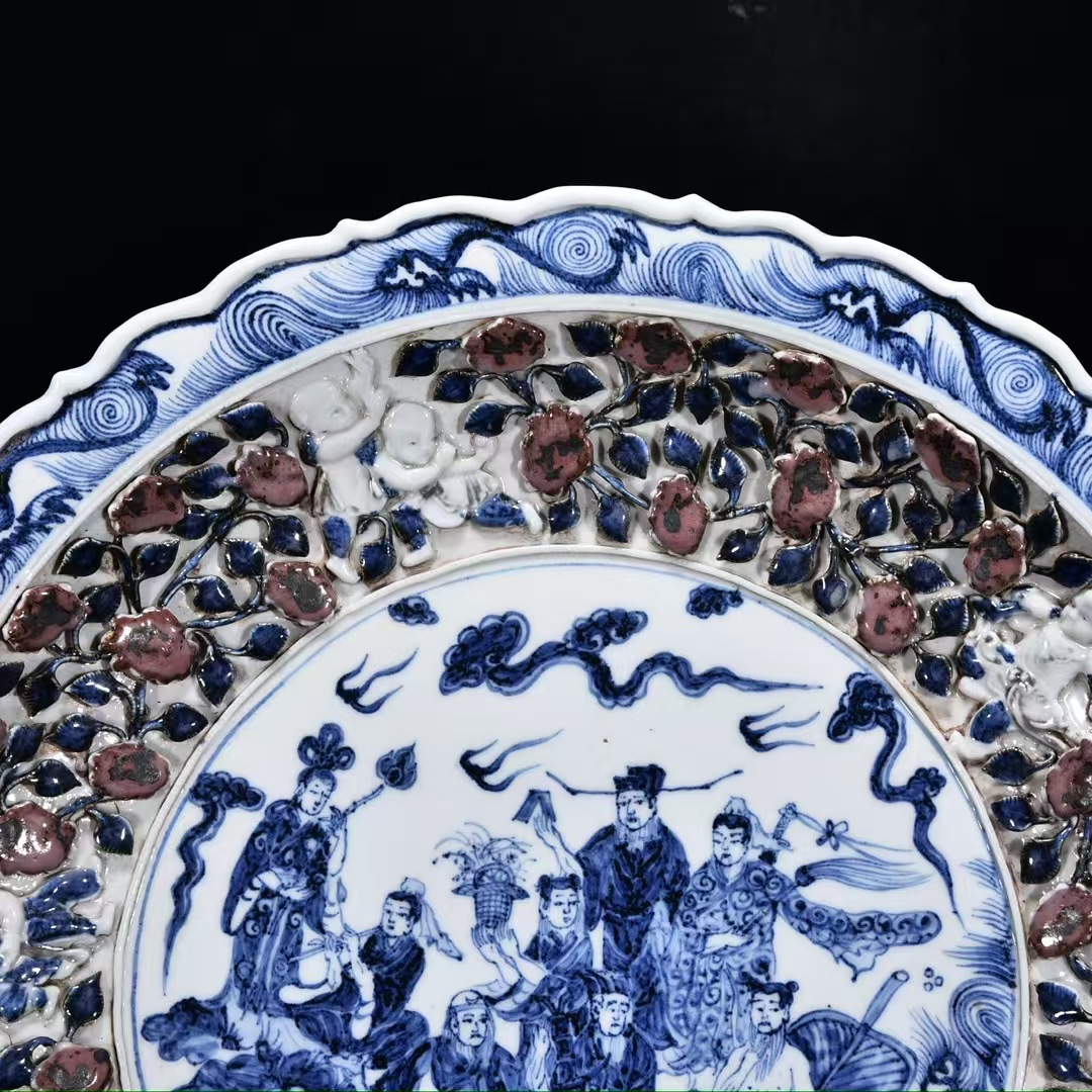 磁器 元時代 青花釉里紅捏花八仙人物盤・皿 秘蔵 直径44cm 古陶磁器 陶芸 唐物 古賞物 時代物 骨董品 古置物 中国磁器 古美味 中国古玩921